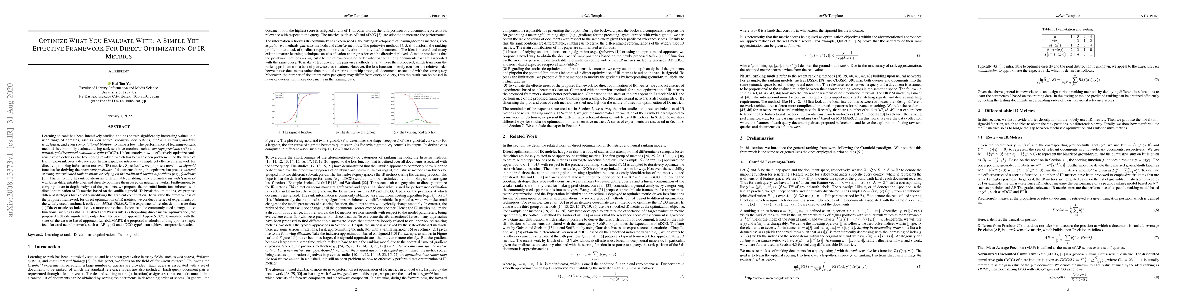 This paper introduces a novel framework for directly optimizing information retrieval metrics like average precision and nDCG, using a differentiable twin-sigmoid function to derive exact rank positions. The approach enables the reformulation of these metrics as differentiable functions, allowing for direct optimization via neural networks. The authors propose strategies to address limitations of vanilla sigmoid-based optimization and validate their method through experiments on the MSLRWEB30K dataset.
