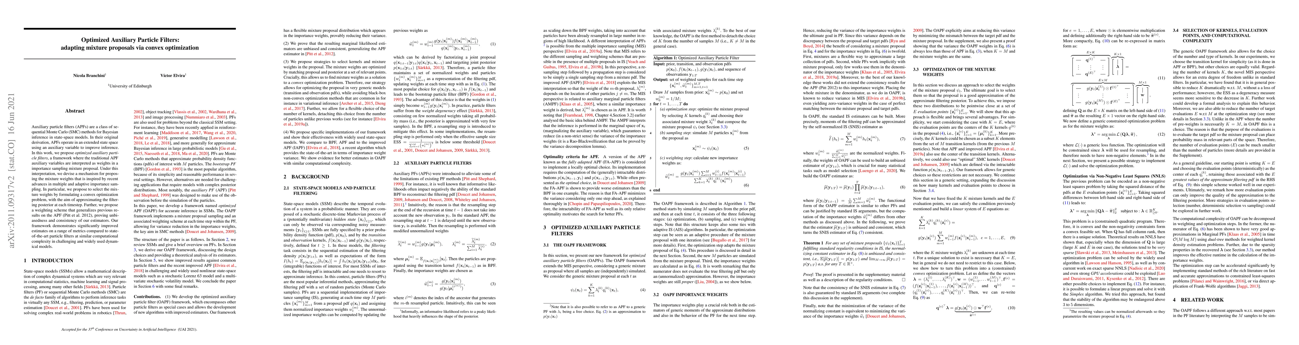 This paper proposes optimized auxiliary particle filters, where traditional auxiliary variables are used as weights in an importance sampling mixture proposal. The mixture weights are selected via a convex optimization problem to better approximate the filtering posterior, demonstrating improved performance over state-of-the-art particle filters.