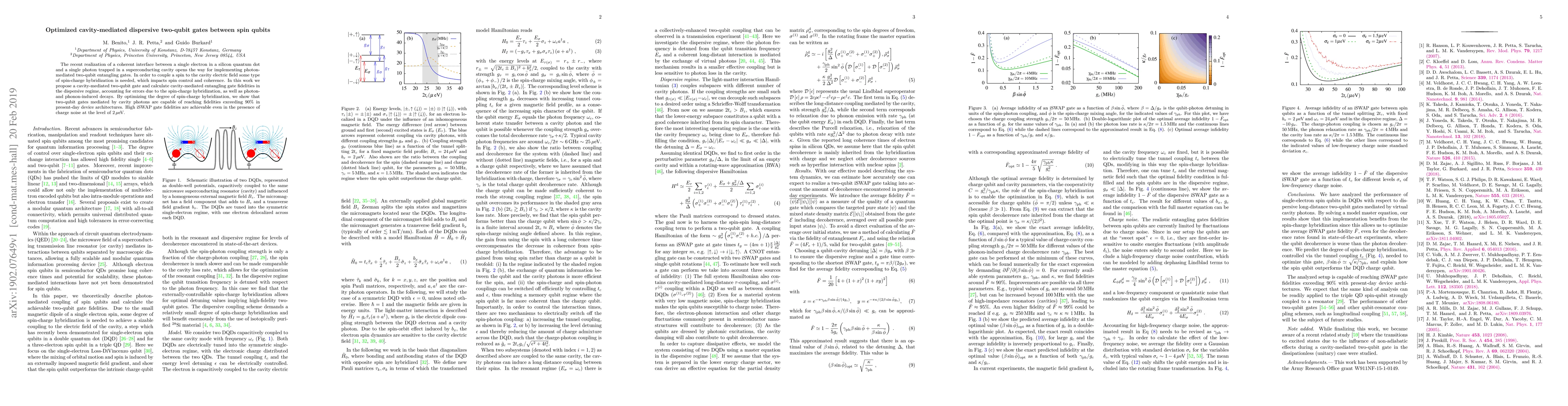 The recent realization of a coherent interface between a single electron in a silicon quantum dot and a single photon trapped in a superconducting cavity opens the way for implementing photon-mediated two-qubit entangling gates. In order to couple a spin to the cavity electric field some type of spin-charge hybridization is needed, which impacts spin control and coherence. In this work we propose a cavity-mediated two-qubit gate and calculate cavity-mediated entangling gate fidelities in the dispersive regime, accounting for errors due to the spin-charge hybridization, as well as photon- and phonon-induced decays. By optimizing the degree of spin-charge hybridization, we show that two-qubit gates mediated by cavity photons are capable of reaching fidelities exceeding 90% in present-day device architectures. High iSWAP gate fidelities are achievable even in the presence of charge noise at the level of $2\,\mu\text{eV}$.