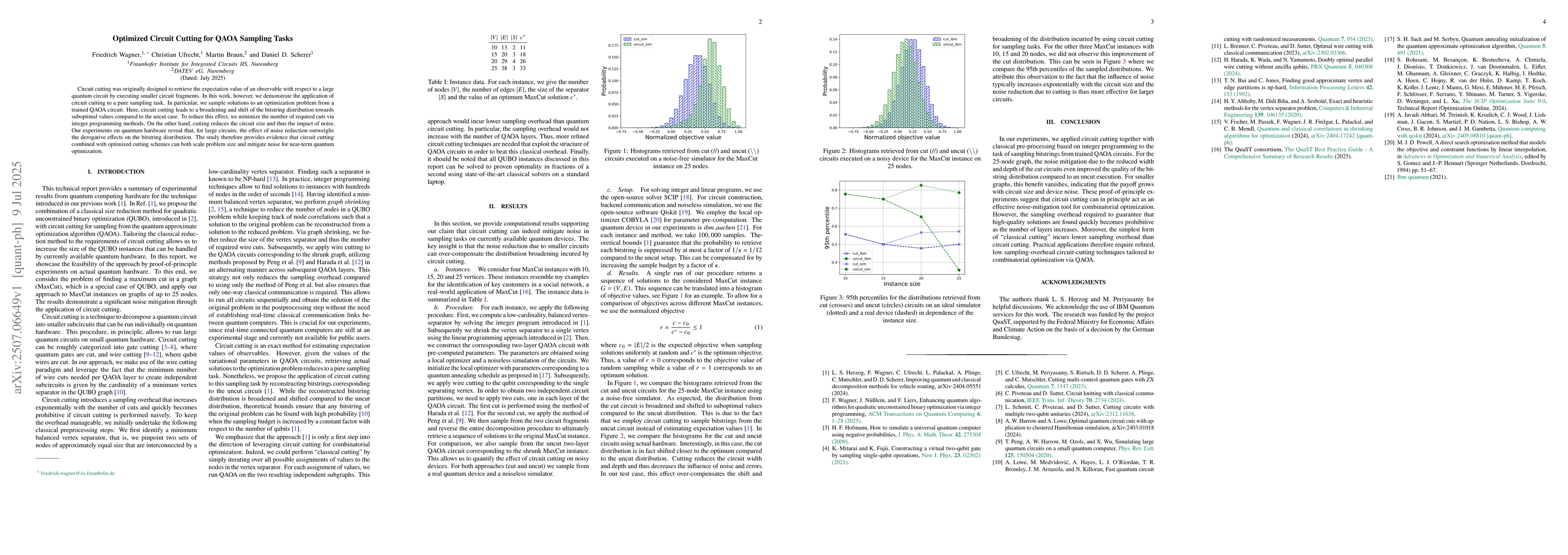 Circuit cutting was originally designed to retrieve the expectation value of an observable with respect to a large quantum circuit by executing smaller circuit fragments. In this work, however, we demonstrate the application of circuit cutting to a pure sampling task. In particular, we sample solutions to an optimization problem from a trained QAOA circuit. Here, circuit cutting leads to a broadening and shift of the bitstring distribution towards suboptimal values compared to the uncut case. To reduce this effect, we minimize the number of required cuts via integer programming methods. On the other hand, cutting reduces the circuit size and thus the impact of noise. Our experiments on quantum hardware reveal that, for large circuits, the effect of noise reduction outweighs the derogative effects on the bitstring distribution. The study therefore provides evidence that circuit cutting combined with optimized cutting schemes can both scale problem size and mitigate noise for near-term quantum optimization.