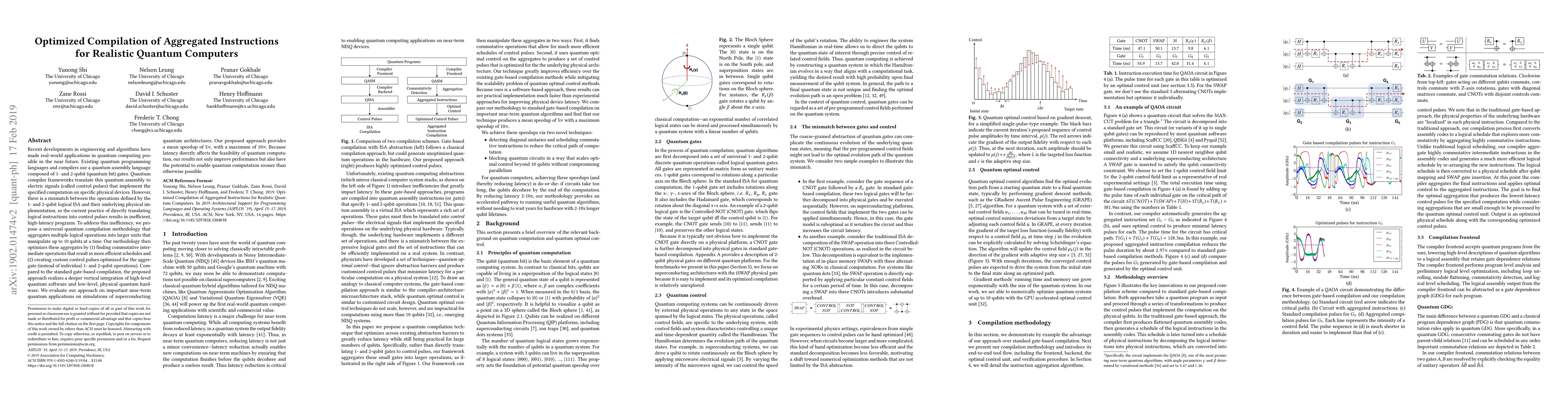 This paper proposes a novel quantum compilation methodology that aggregates multiple logical operations into larger units to optimize quantum programs for physical devices, achieving up to 10x speedup over traditional gate-based compilation by optimizing control pulses and finding commutative operations. This approach aims to bridge the gap between logical and physical quantum instructions, potentially accelerating the realization of practical quantum computing.