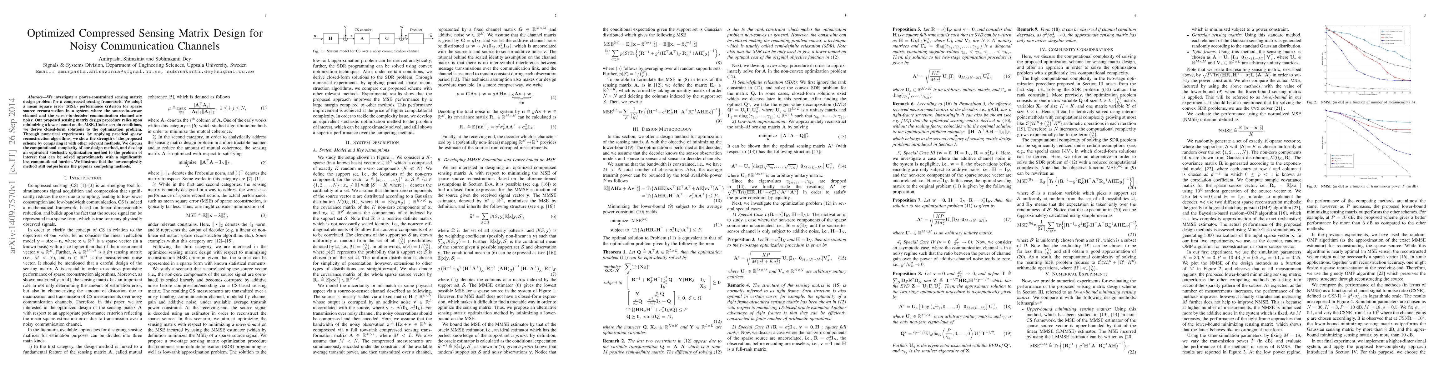 This paper proposes an optimized design for compressed sensing matrices under noisy communication channels, focusing on minimizing mean square error for sparse source reconstruction. The method involves deriving closed-form solutions and a low-complexity stochastic optimization approach, which outperforms existing methods despite reduced computational effort.