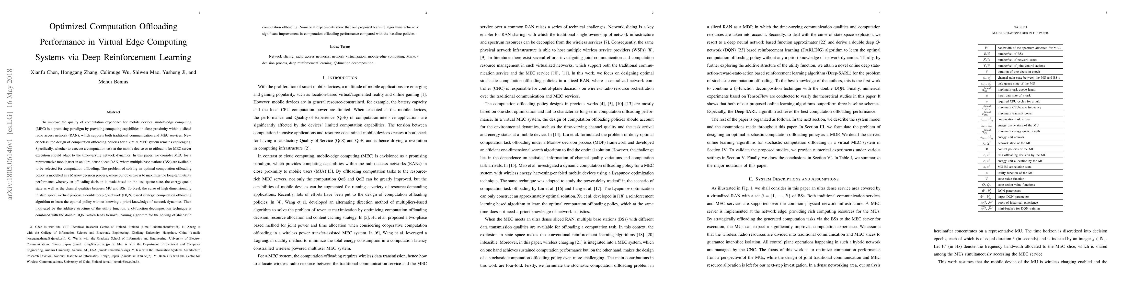 To improve the quality of computation experience for mobile devices, mobile-edge computing (MEC) is a promising paradigm by providing computing capabilities in close proximity within a sliced radio access network (RAN), which supports both traditional communication and MEC services. Nevertheless, the design of computation offloading policies for a virtual MEC system remains challenging. Specifically, whether to execute a computation task at the mobile device or to offload it for MEC server execution should adapt to the time-varying network dynamics. In this paper, we consider MEC for a representative mobile user in an ultra-dense sliced RAN, where multiple base stations (BSs) are available to be selected for computation offloading. The problem of solving an optimal computation offloading policy is modelled as a Markov decision process, where our objective is to maximize the long-term utility performance whereby an offloading decision is made based on the task queue state, the energy queue state as well as the channel qualities between MU and BSs. To break the curse of high dimensionality in state space, we first propose a double deep Q-network (DQN) based strategic computation offloading algorithm to learn the optimal policy without knowing a priori knowledge of network dynamics. Then motivated by the additive structure of the utility function, a Q-function decomposition technique is combined with the double DQN, which leads to novel learning algorithm for the solving of stochastic computation offloading. Numerical experiments show that our proposed learning algorithms achieve a significant improvement in computation offloading performance compared with the baseline policies.