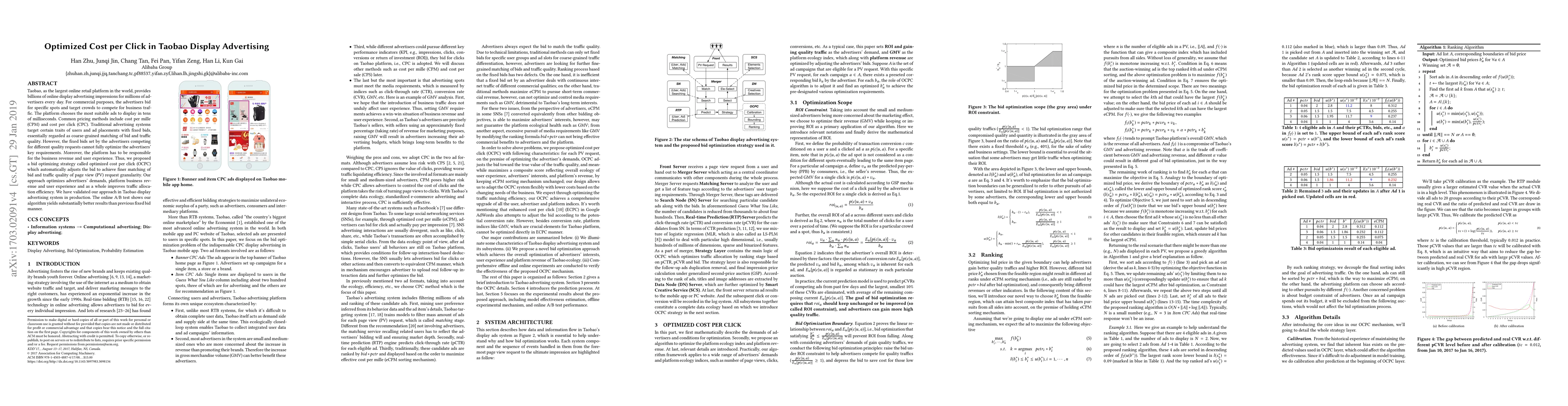 This paper proposes an optimized cost per click (OCPC) strategy to improve Taobao's display advertising system by fine-tuning bids to better match ad quality and traffic. The approach enhances advertiser satisfaction, platform revenue, and user experience, as demonstrated by successful implementation and A/B testing results.