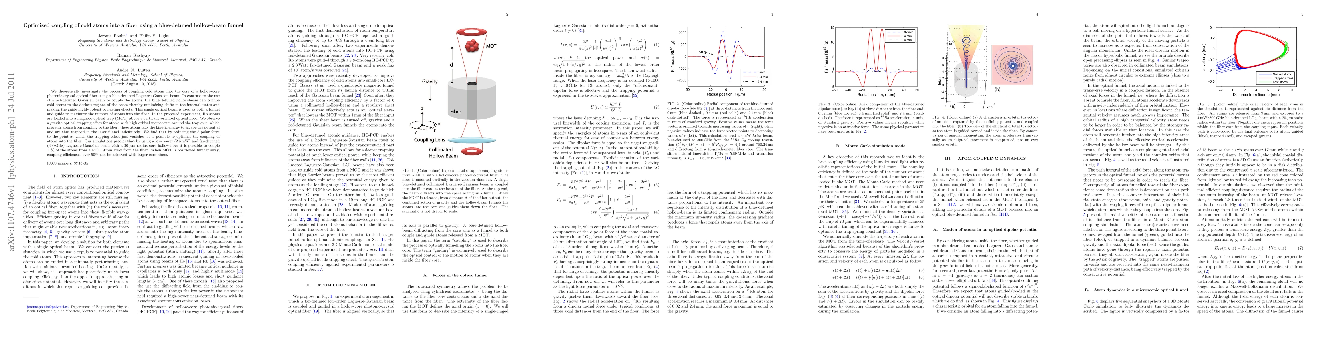 This paper proposes a blue-detuned Laguerre-Gaussian beam to optimize the coupling of cold atoms into a hollow-core photonic-crystal optical fiber, achieving higher efficiencies than red-detuned beams by minimizing internal state shifts and heating effects. Simulations predict coupling efficiencies of up to 50% for larger core fibers when the magneto-optical trap is positioned further away from the fiber.
