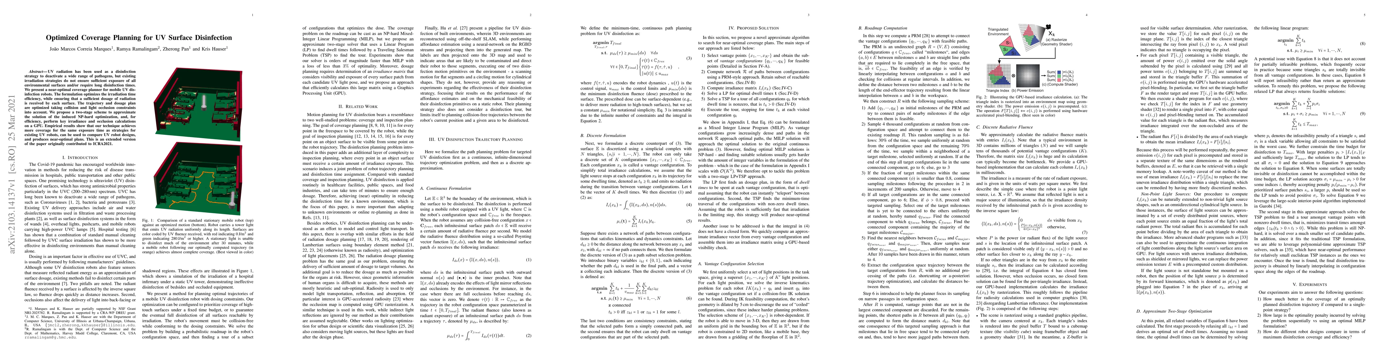 UV radiation has been used as a disinfection strategy to deactivate a wide range of pathogens, but existing irradiation strategies do not ensure sufficient exposure of all environmental surfaces and/or require long disinfection times. We present a near-optimal coverage planner for mobile UV disinfection robots. The formulation optimizes the irradiation time efficiency, while ensuring that a sufficient dosage of radiation is received by each surface. The trajectory and dosage plan are optimized taking collision and light occlusion constraints into account. We propose a two-stage scheme to approximate the solution of the induced NP-hard optimization, and, for efficiency, perform key irradiance and occlusion calculations on a GPU. Empirical results show that our technique achieves more coverage for the same exposure time as strategies for existing UV robots, can be used to compare UV robot designs, and produces near-optimal plans. This is an extended version of the paper originally contributed to ICRA2021.