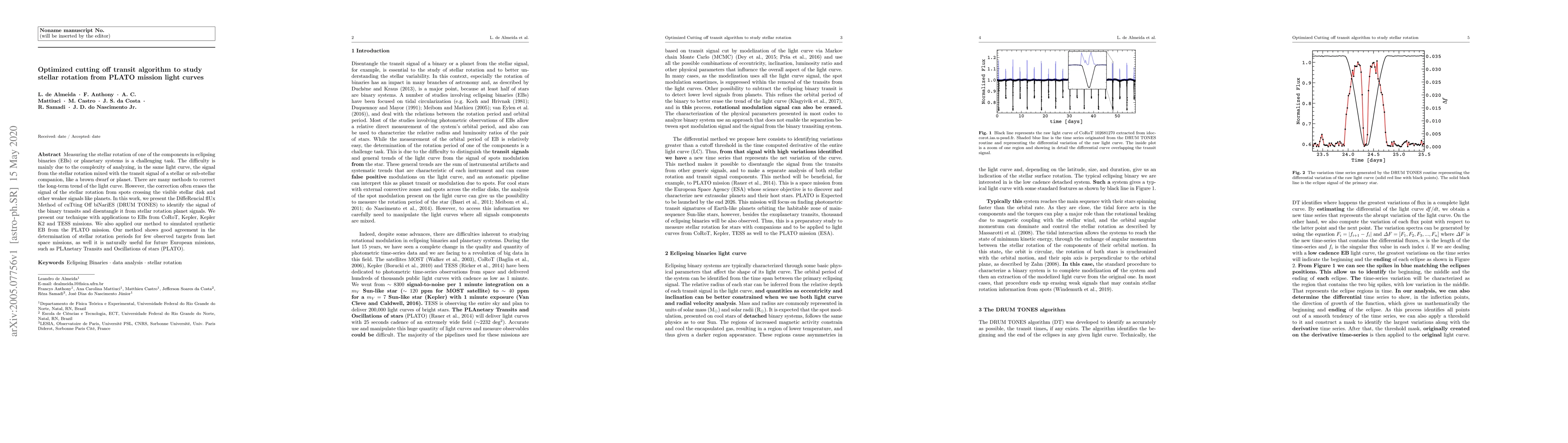 This paper introduces the DiffeRencial flUx Method of cuTting Off biNariES (DRUM TONES) to disentangle stellar rotation signals from transit light curves in eclipsing binaries, demonstrating its effectiveness on data from CoRoT, Kepler, Kepler K2, TESS, and simulated PLATO missions. The method shows promising results for future PLATO mission analyses.