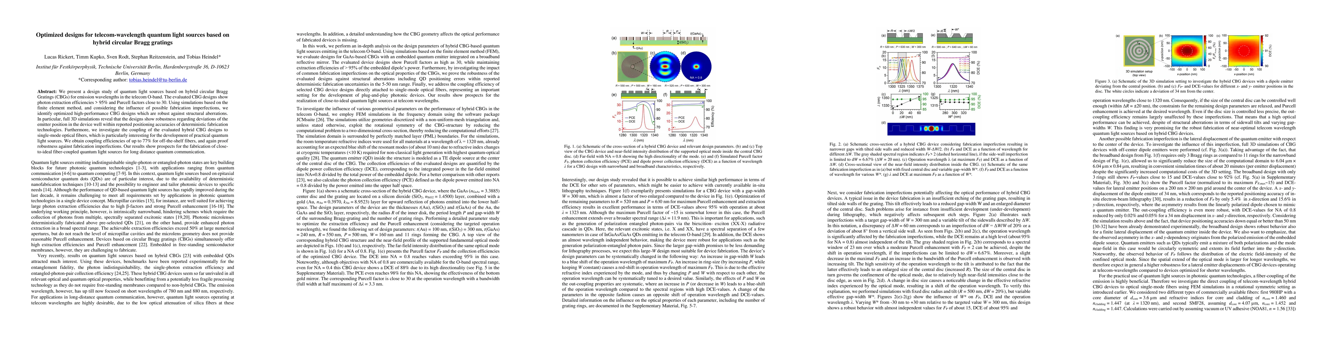 This study designs high-efficiency quantum light sources using hybrid circular Bragg Gratings (CBGs) for telecom O-band wavelengths, achieving photon extraction efficiencies over 95% and Purcell factors close to 30, while demonstrating robustness against fabrication imperfections and high coupling efficiencies to single-mode optical fibers.
