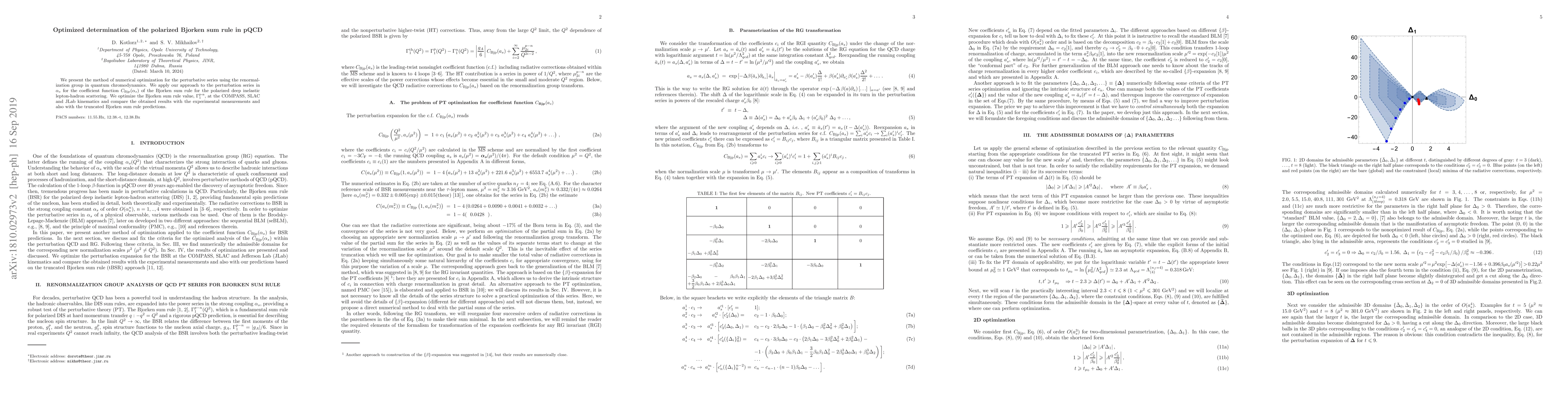This paper introduces a numerical optimization method for the perturbative series in quantum chromodynamics, specifically applied to the coefficient function $C_\text{Bjp}(\alpha_s)$ of the Bjorken sum rule. The optimized value of $\Gamma_1^\text{p-n}$ is compared with experimental measurements and previous predictions.