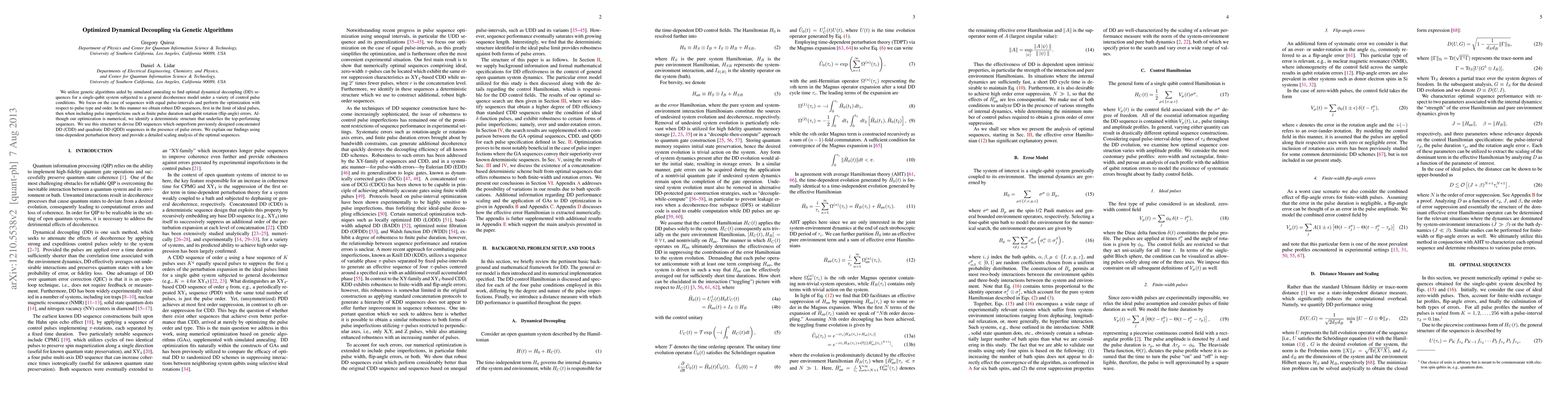 Genetic algorithms are used to optimize dynamical decoupling (DD) sequences for a single-qubit system, considering pulse imperfections such as finite pulse duration and qubit rotation errors. The optimization focuses on sequences with equal pulse intervals, varying pulse types and orders, and extends to include pulse imperfections.