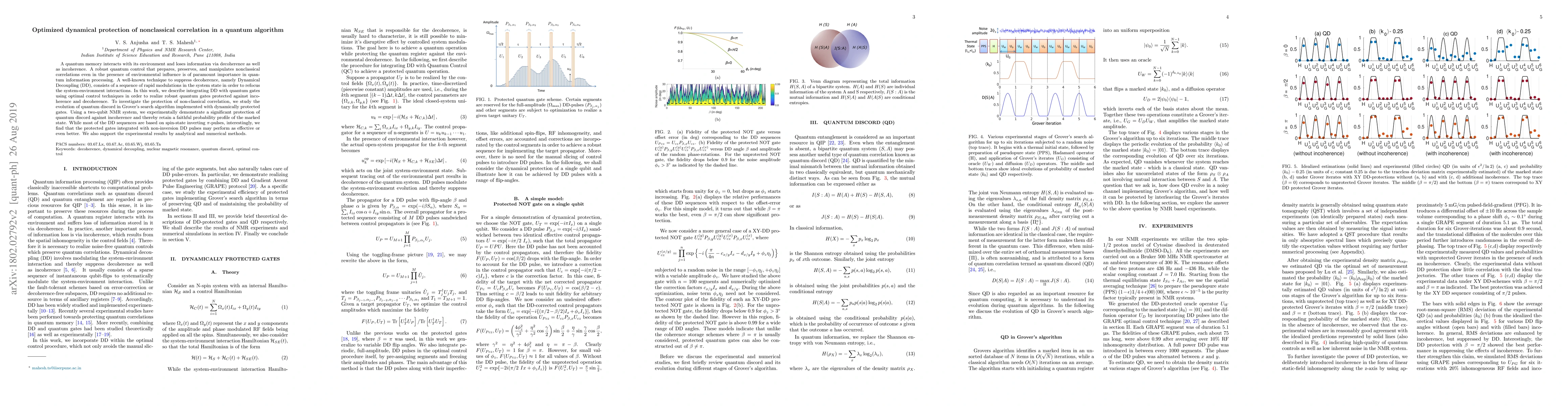 A quantum memory interacts with its environment and loses information via decoherence as well as incoherence. A robust quantum control that prepares, preserves, and manipulates nonclassical correlations even in the presence of environmental influence is of paramount importance in quantum information processing. A well-known technique to suppress decoherence, namely Dynamical Decoupling (DD), consists of a sequence of rapid flips applied to the system in order to refocus the system-environment interactions. In this work, we integrate DD with quantum gates using optimal control techniques to realize robust quantum gates which offer protection against decoherence. To investigate the protection of non-classical correlation, we study the evolution of quantum discord in Grover's search algorithm implemented with dynamically protected gates. Using a two-qubit NMR system, we experimentally demonstrate a significant protection against decoherence and incoherence. We find better performances by phase alternating DD sequences with suitable spacings between the DD pulses. Interestingly, we also find that DD sequences based on $\pi/2$ pulses perform as well as or even better than those with $\pi$ pulses in protecting the non-classical correlation. We also support the experimental results by analyzing the robustness of various DD schemes.