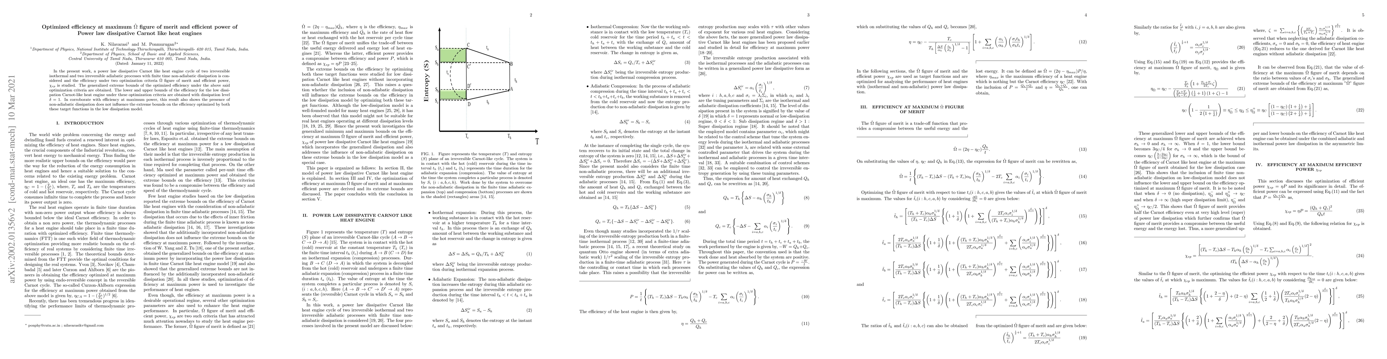 This paper investigates the efficiency optimization of a power law dissipative Carnot-like heat engine under two criteria: $\dot{\Omega}$ figure of merit and efficient power, $\chi_{ep}$. It finds that the presence of non-adiabatic dissipation does not affect the optimal efficiency bounds in the low dissipation model.