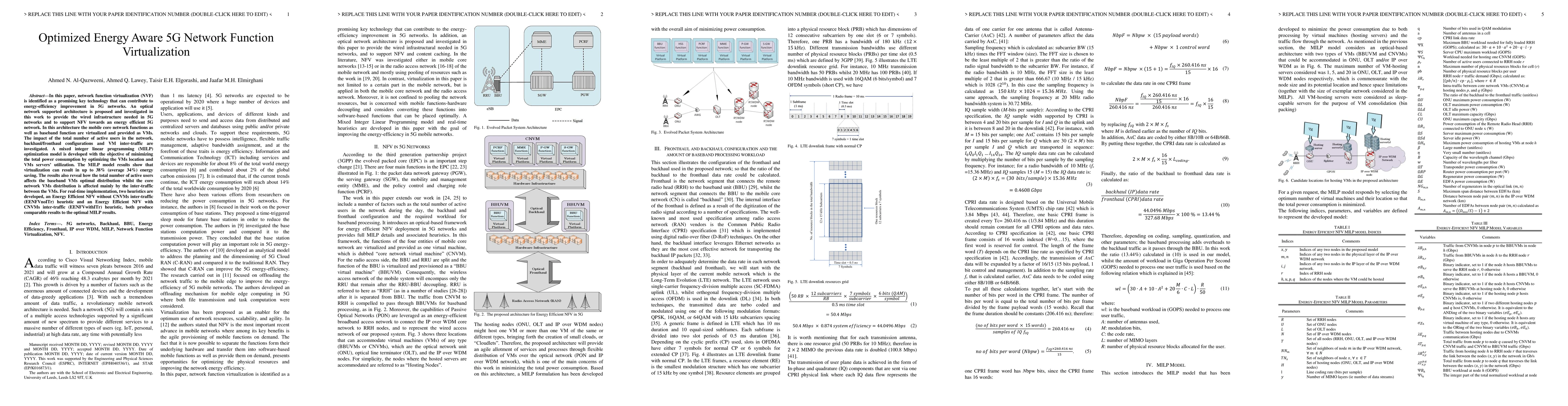 This paper proposes an optical network architecture for energy-efficient 5G networks leveraging Network Function Virtualization (NFV). An optimized mixed integer linear programming model minimizes power consumption by optimizing VM locations and server utilization, achieving up to 38% energy savings on average. Two heuristics developed for real-time implementation show comparable energy efficiency to the optimal model.