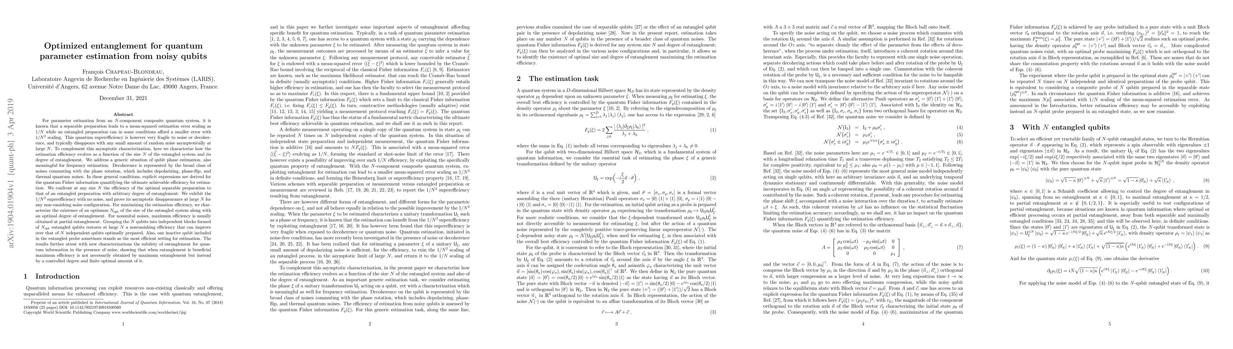 This paper investigates the efficiency of quantum parameter estimation from entangled versus separable qubit preparations under various noise conditions. It finds that while entangled states can achieve superefficient $1/N^2$ error scaling, this advantage diminishes with noise, especially for large systems. The study identifies optimal system sizes and entanglement degrees for maximizing efficiency, revealing that partial entanglement and grouping qubits into blocks can yield improved performance over independent qubit preparations.