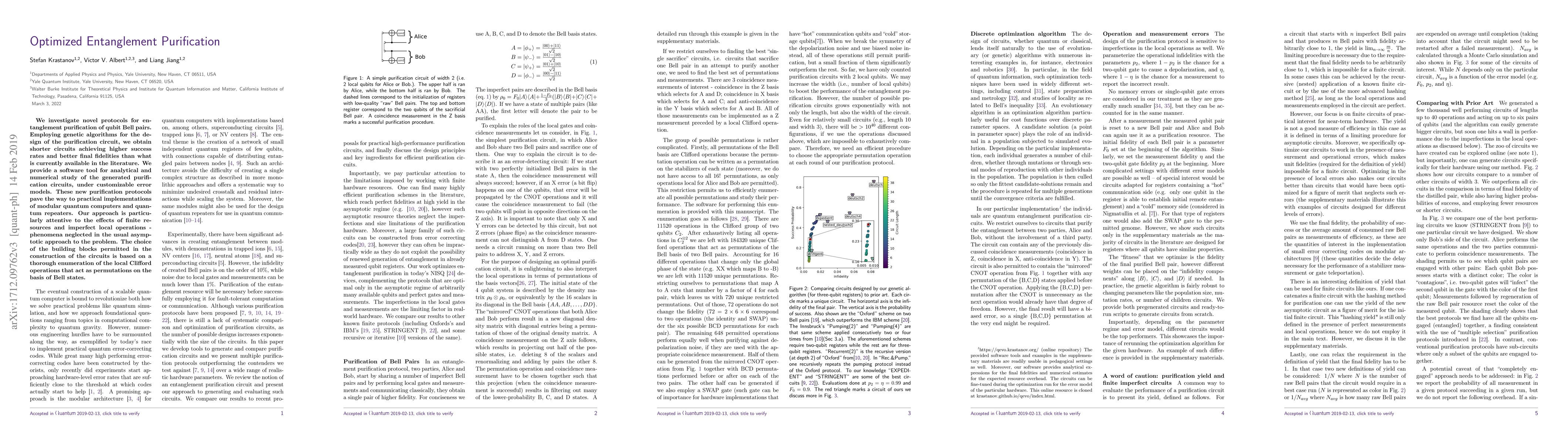 This paper presents optimized protocols for entanglement purification using genetic algorithms, resulting in shorter circuits with higher success rates and better fidelities compared to existing methods. The research also introduces a software tool for studying these circuits under customizable error models, emphasizing practical implementations for quantum computers and repeaters.