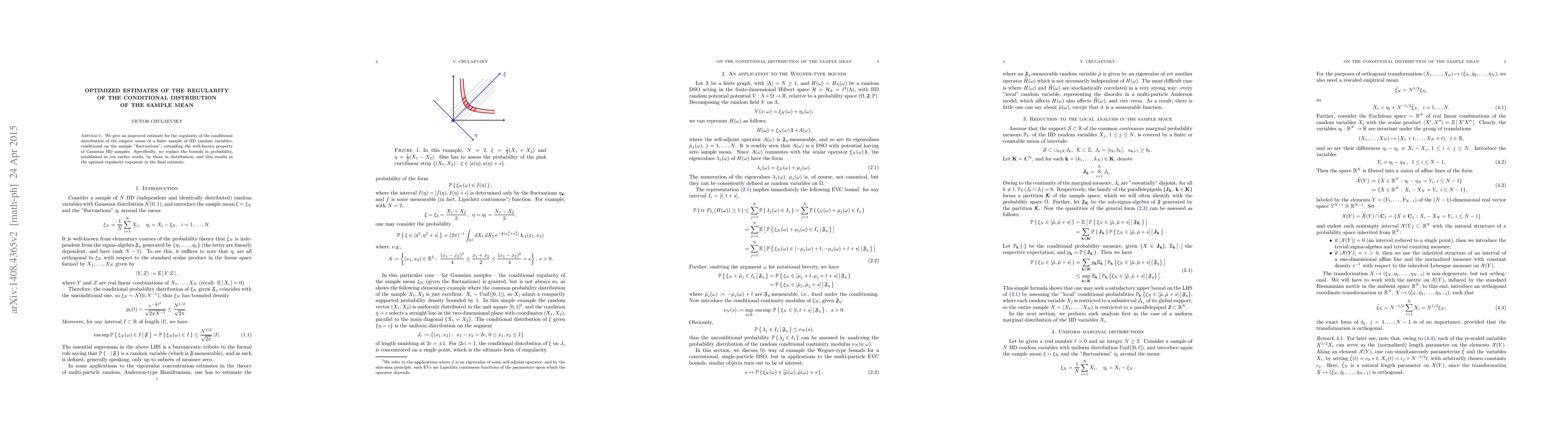 We give an improved estimate for the regularity of the conditional distribution of the empiric mean of a finite sample of IID random variables, conditional on the sample "fluctuations", extending the well-known property of Gaussian IID samples. Specifically, we replace the bounds in probability, established in our earlier works, by those in distribution, and this results in the optimal regularity exponent in the final estimate.