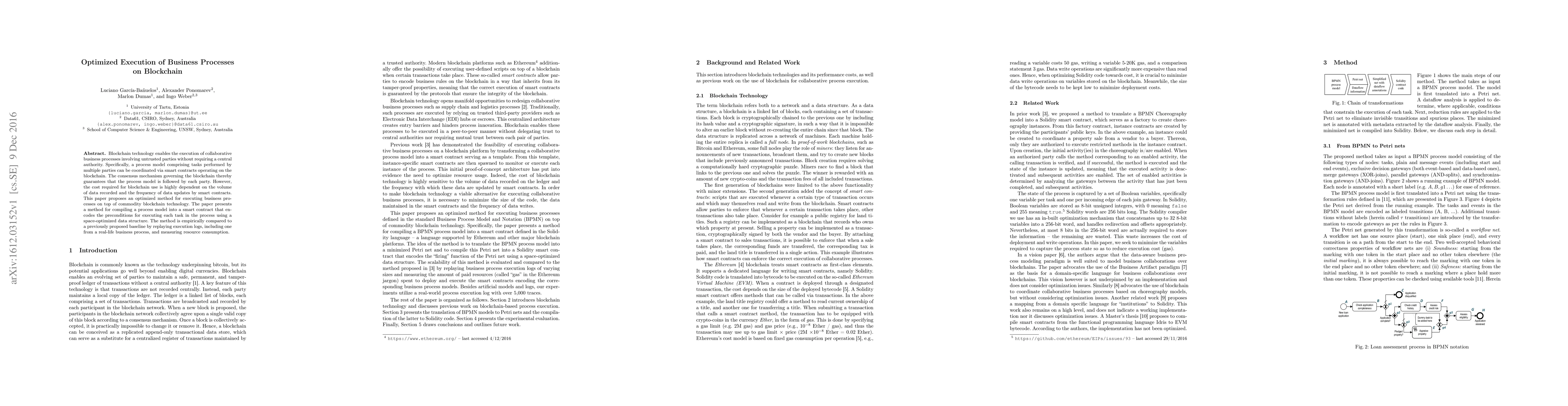 This paper proposes an optimized method for executing business processes on blockchain using smart contracts, focusing on reducing resource consumption through a space-optimized data structure. Empirical comparisons with a baseline method show improved efficiency and lower costs in process execution.