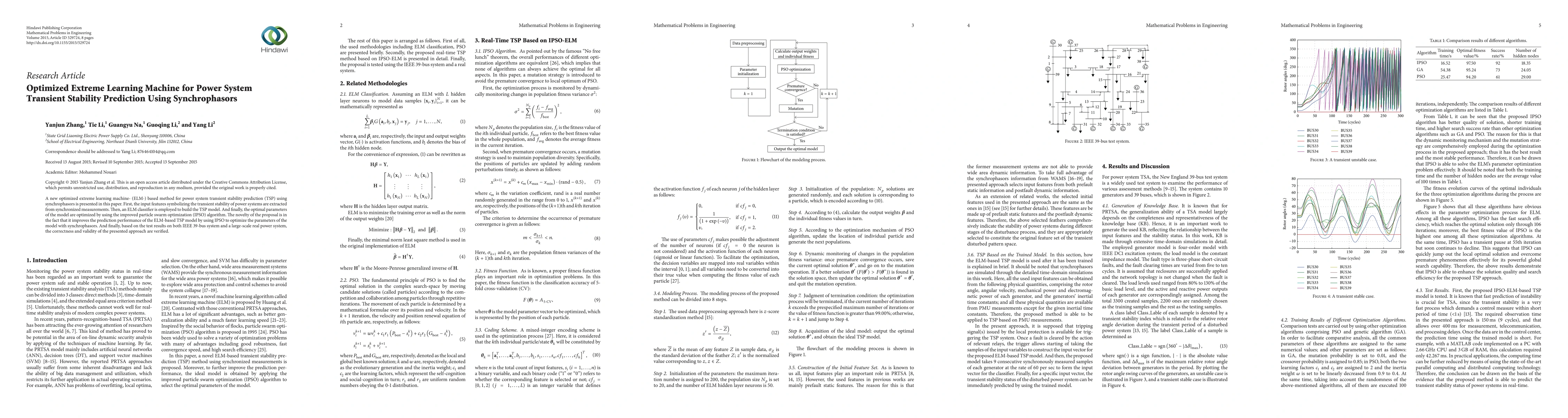 A new optimized extreme learning machine- (ELM-) based method for power system transient stability prediction (TSP) using synchrophasors is presented in this paper. First, the input features symbolizing the transient stability of power systems are extracted from synchronized measurements. Then, an ELM classifier is employed to build the TSP model. And finally, the optimal parameters of the model are optimized by using the improved particle swarm optimization (IPSO) algorithm. The novelty of the proposal is in the fact that it improves the prediction performance of the ELM-based TSP model by using IPSO to optimize the parameters of the model with synchrophasors. And finally, based on the test results on both IEEE 39-bus system and a large-scale real power system, the correctness and validity of the presented approach are verified.