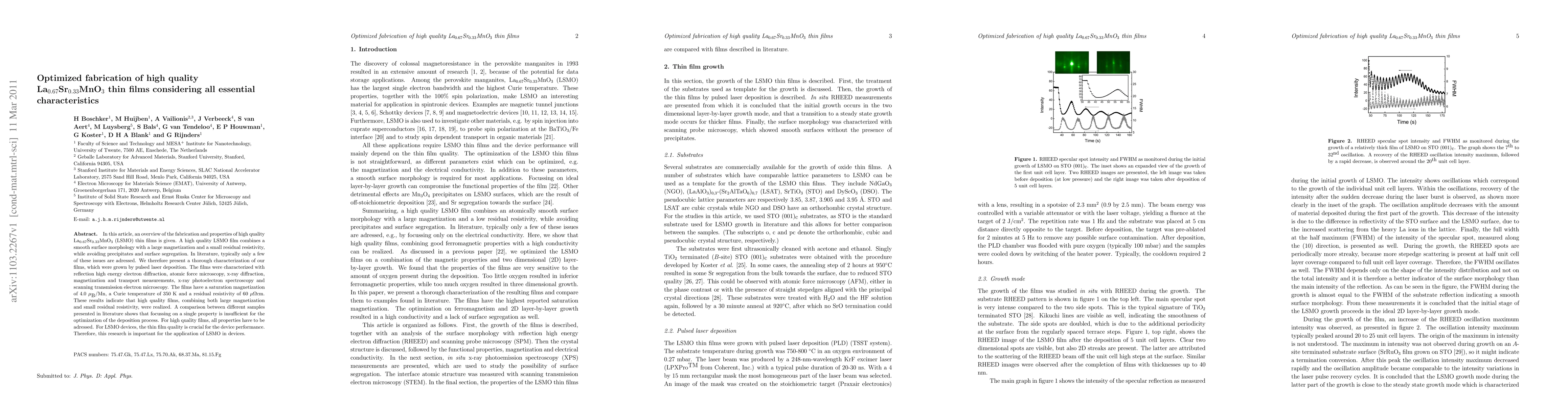 This paper details the optimized fabrication of high-quality La0.67Sr0.33MnO3 thin films using pulsed laser deposition, emphasizing a comprehensive approach to achieving smooth surface morphology, large magnetization, and low residual resistivity. The study highlights the importance of addressing all essential characteristics for optimal film quality, crucial for LSMO device applications.