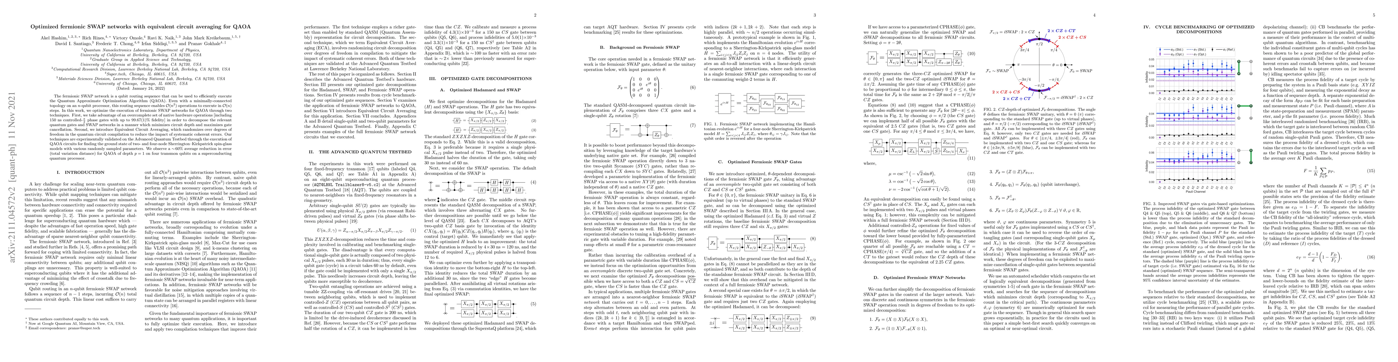 The fermionic SWAP network is a qubit routing sequence that can be used to efficiently execute the Quantum Approximate Optimization Algorithm (QAOA). Even with a minimally-connected topology on an n-qubit processor, this routing sequence enables O(n^2) operations to execute in O(n) steps. In this work, we optimize the execution of fermionic SWAP networks for QAOA through two techniques. First, we take advantage of an overcomplete set of native hardware operations [including 150 ns controlled-pi/2 phase gates with up to 99.67(1)% fidelity] in order to decompose the relevant quantum gates and SWAP networks in a manner which minimizes circuit depth and maximizes gate cancellation. Second, we introduce Equivalent Circuit Averaging, which randomizes over degrees of freedom in the quantum circuit compilation to reduce the impact of systematic coherent errors. Our techniques are experimentally validated on the Advanced Quantum Testbed through the execution of QAOA circuits for finding the ground state of two- and four-node Sherrington-Kirkpatrick spin-glass models with various randomly sampled parameters. We observe a ~60% average reduction in error (total variation distance) for QAOA of depth p = 1 on four transmon qubits on a superconducting quantum processor.