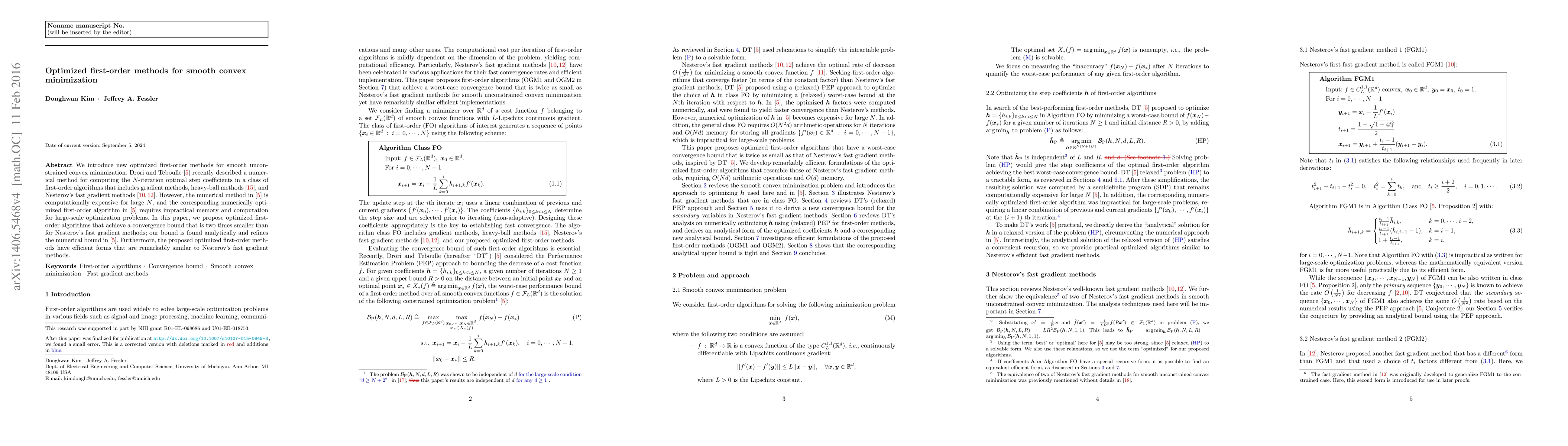 Researchers developed optimized first-order methods for smooth convex minimization, achieving a convergence bound two times smaller than Nesterov's fast gradient methods with efficient recursive forms.