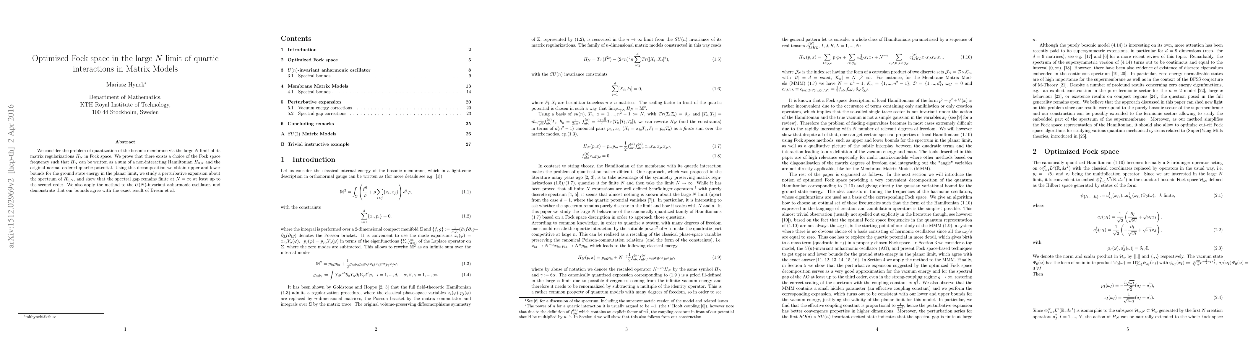 We consider the problem of quantization of the bosonic membrane via the large $N$ limit of its matrix regularizations $H_N$ in Fock space. We prove that there exists a choice of the Fock space frequency such that $ H_N$ can be written as a sum of a non-interacting Hamiltonian $H_{0,N}$ and the original normal ordered quartic potential. Using this decomposition we obtain upper and lower bounds for the ground state energy in the planar limit, we study a perturbative expansion about the spectrum of $H_{0,N}$, and show that the spectral gap remains finite at $N=\infty$ at least up to the second order. We also apply the method to the $U(N)$-invariant anharmonic oscillator, and demonstrate that our bounds agree with the exact result of Brezin et al.