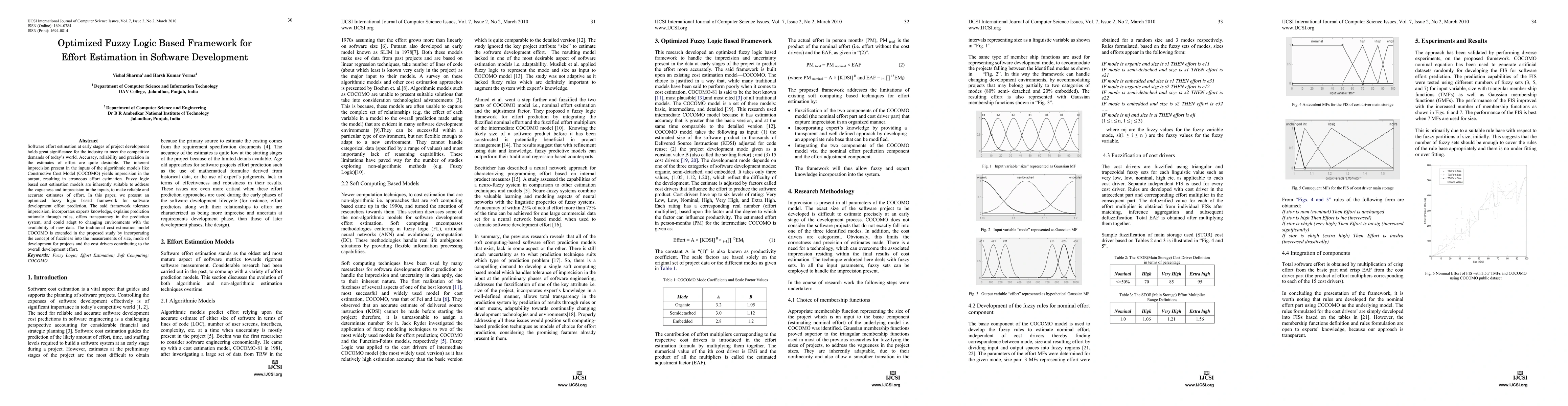 This paper proposes an optimized fuzzy logic framework for software effort estimation that enhances accuracy and reliability by addressing input imprecision, incorporating expert knowledge, and adapting to changing environments. The framework extends the COCOMO model by integrating fuzziness into size, development mode, and cost driver measurements.