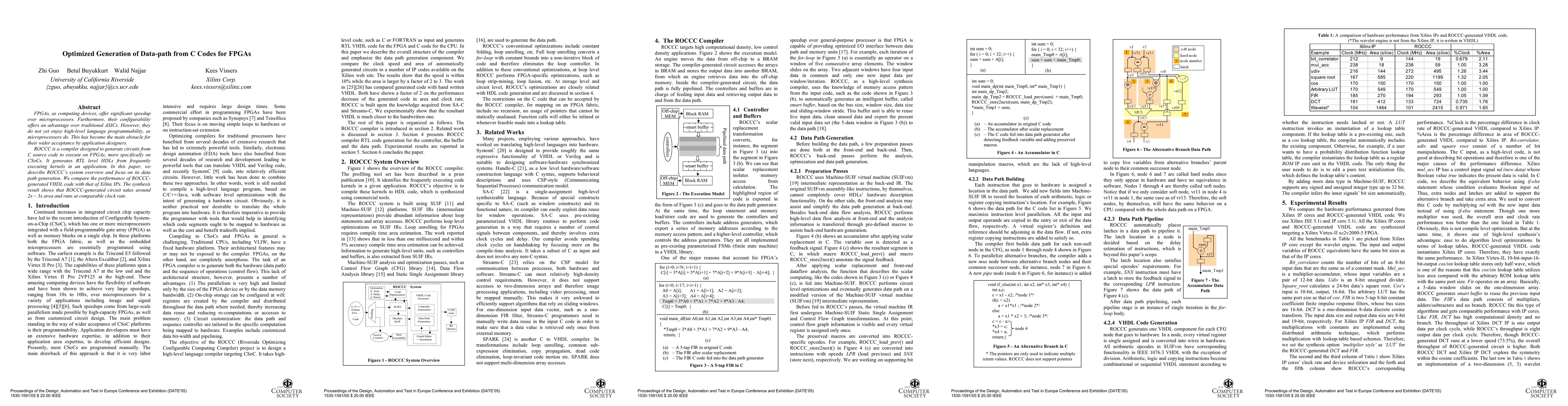 This paper presents ROCCC, a compiler for generating RTL HDLs from C source code to optimize FPGA implementation, focusing on data path generation. The comparison shows ROCCC-generated VHDL code requires 2x to 3x more area but achieves similar clock rates compared to Xilinx IPs.