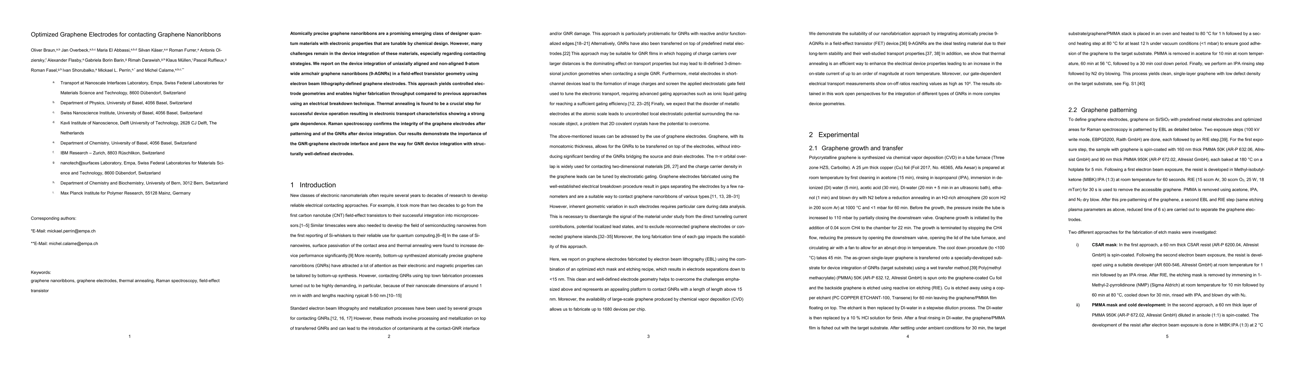 This paper details a new method for integrating atomically precise graphene nanoribbons into field-effect transistors using electron beam lithography-defined graphene electrodes, achieving better control and higher throughput than previous techniques. Thermal annealing is essential for optimal device performance, as confirmed by Raman spectroscopy.