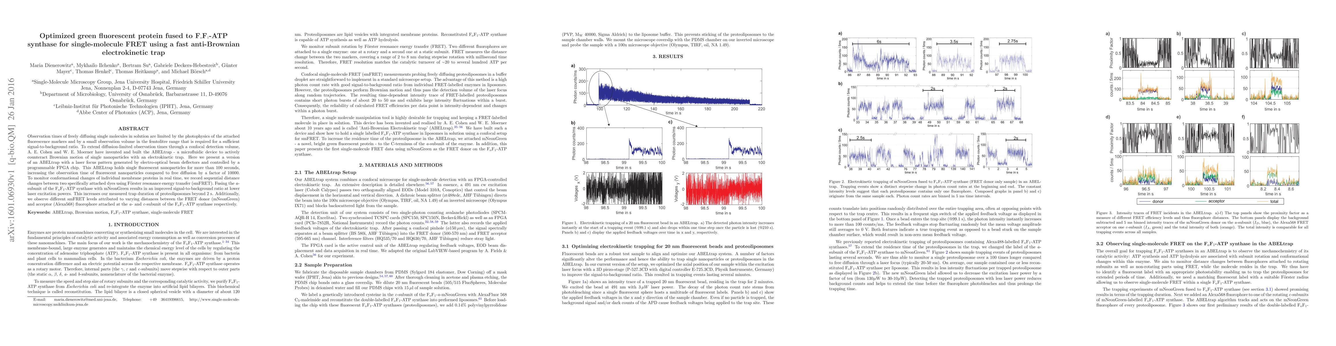This paper presents an optimized ABELtrap device using an electrokinetic trap to extend observation times for single fluorescent nanoparticles by a factor of 10,000. It employs a fusion of green fluorescent protein with FoF1-ATP synthase to enhance signal-to-background ratio, enabling real-time monitoring of conformational changes via single-molecule FRET.