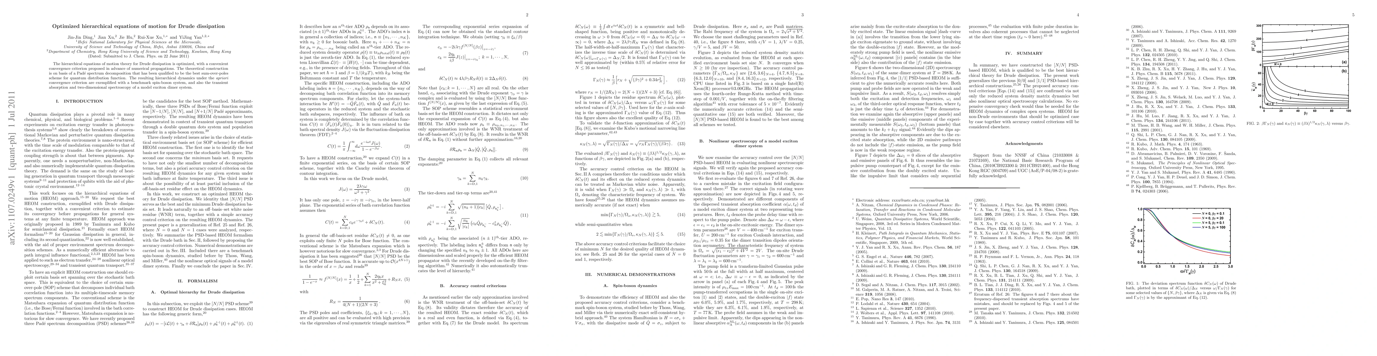 This paper optimizes the hierarchical equations of motion for Drude dissipation using a Padé spectrum decomposition, proposing an apriori convergence criterion. The optimized theory is demonstrated through benchmark systems, including spin-boson and exciton dimer systems, showcasing its application in transient absorption and two-dimensional spectroscopy.
