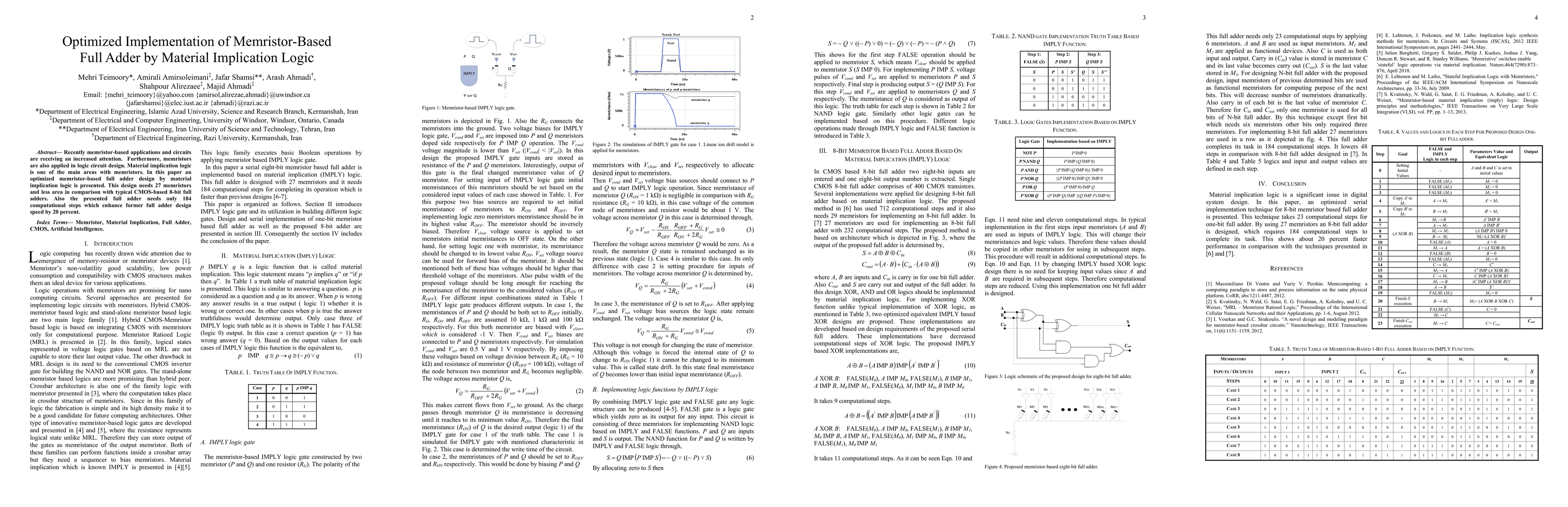 This paper presents an optimized memristor-based full adder using material implication logic, requiring 27 memristors and less area compared to traditional CMOS designs. It also improves speed by 20%, needing only 184 computational steps.