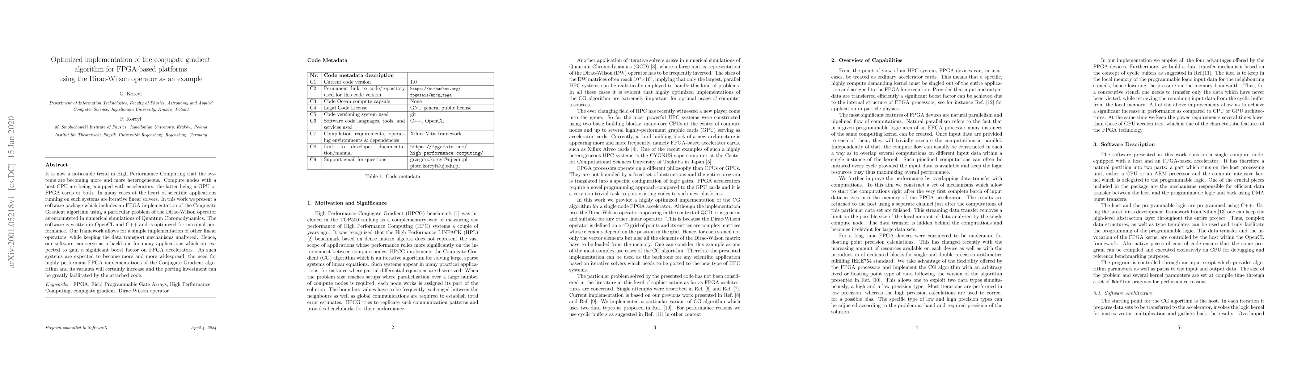 This paper presents an optimized FPGA implementation of the Conjugate Gradient algorithm using the Dirac-Wilson operator for Quantum Chromodynamics simulations. The software, written in OpenCL and C++, aims to facilitate high-performance computing on heterogeneous systems with FPGA accelerators.