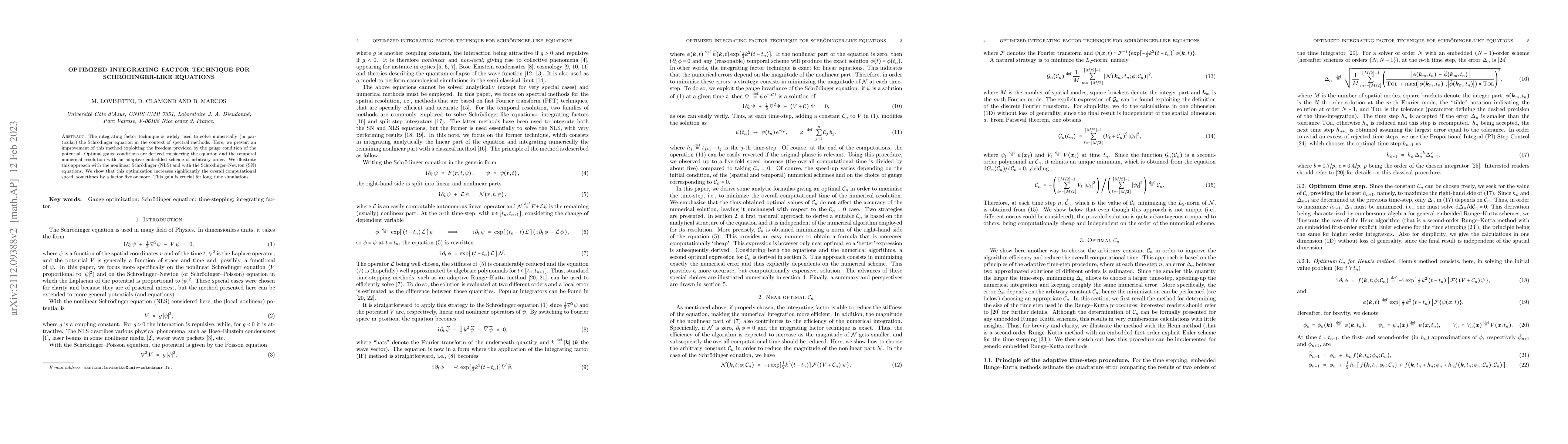 This paper optimizes the integrating factor technique for solving Schrödinger-like equations by exploiting gauge conditions and adaptive numerical resolution. The optimization significantly boosts computational speed, especially for long-time simulations, as demonstrated through the nonlinear Schrödinger and Schrödinger-Newton equations.