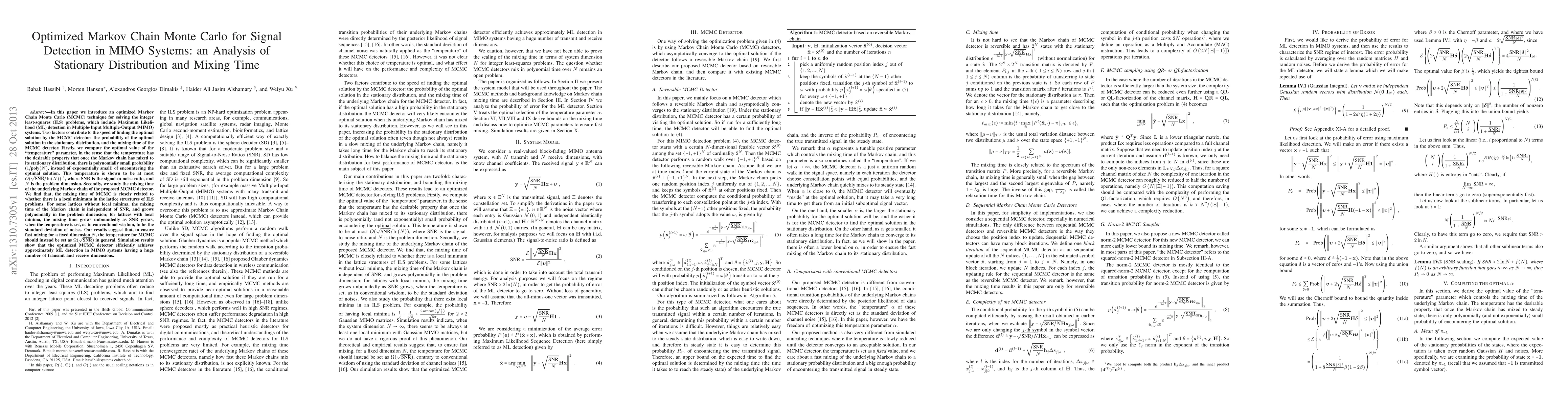 In this paper we introduce an optimized Markov Chain Monte Carlo (MCMC) technique for solving the integer least-squares (ILS) problems, which include Maximum Likelihood (ML) detection in Multiple-Input Multiple-Output (MIMO) systems. Two factors contribute to the speed of finding the optimal solution by the MCMC detector: the probability of the optimal solution in the stationary distribution, and the mixing time of the MCMC detector. Firstly, we compute the optimal value of the "temperature" parameter, in the sense that the temperature has the desirable property that once the Markov chain has mixed to its stationary distribution, there is polynomially small probability ($1/\mbox{poly}(N)$, instead of exponentially small) of encountering the optimal solution. This temperature is shown to be at most $O(\sqrt{SNR}/\ln(N))$, where $SNR$ is the signal-to-noise ratio, and $N$ is the problem dimension. Secondly, we study the mixing time of the underlying Markov chain of the proposed MCMC detector. We find that, the mixing time of MCMC is closely related to whether there is a local minimum in the lattice structures of ILS problems. For some lattices without local minima, the mixing time of the Markov chain is independent of $SNR$, and grows polynomially in the problem dimension; for lattices with local minima, the mixing time grows unboundedly as $SNR$ grows, when the temperature is set, as in conventional wisdom, to be the standard deviation of noises. Our results suggest that, to ensure fast mixing for a fixed dimension $N$, the temperature for MCMC should instead be set as $\Omega(\sqrt{SNR})$ in general. Simulation results show that the optimized MCMC detector efficiently achieves approximately ML detection in MIMO systems having a huge number of transmit and receive dimensions.
