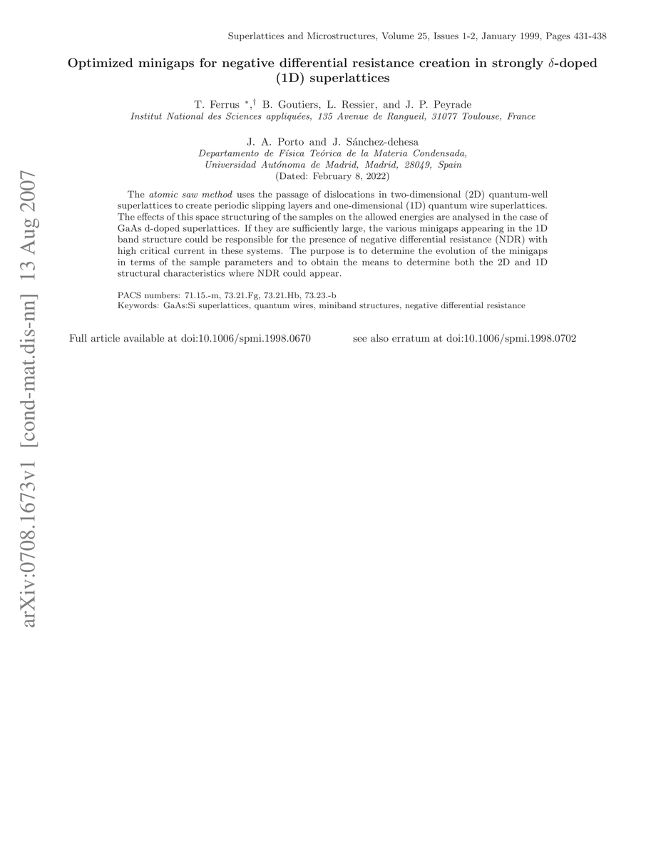The "atomic saw method" uses the passage of dislocations in two-dimensional (2D) quantum-well superlattices to create periodic slipping layers and one-dimensional (1D) quantum wire superlattices. The effects of this space structuring of the samples on the allowed energies are analysed in the case of GaAs d-doped superlattices. If they are sufficiently large, the various minigaps appearing in the 1D band structure could be responsible for the presence of negative differential resistance (NDR) with high critical current in these systems. The purpose is to determine the evolution of the minigaps in terms of the sample parameters and to obtain the means to determine both the 2D and 1D structural characteristics where NDR could appear.