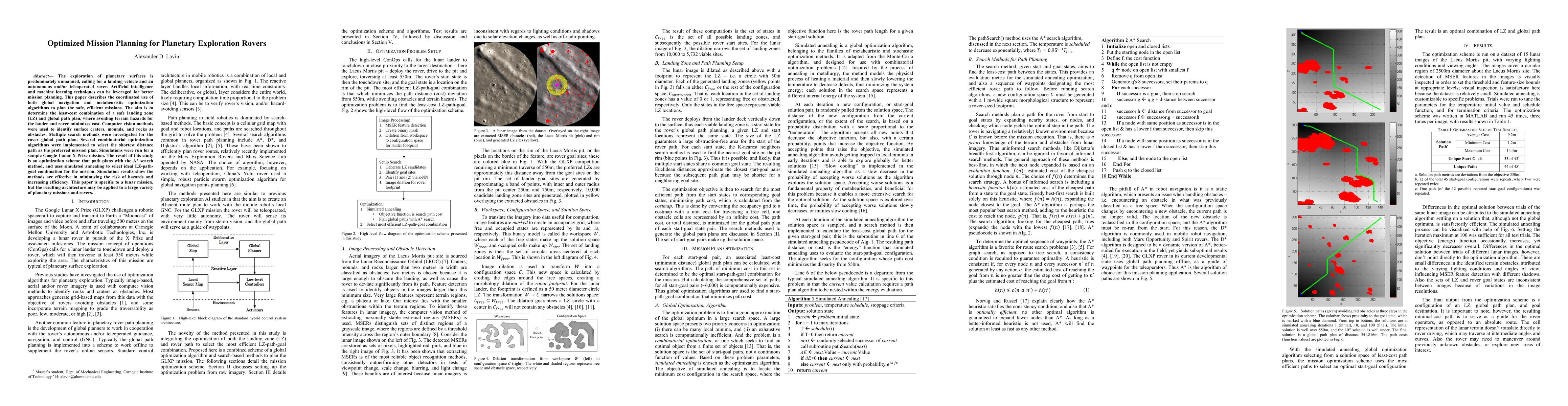 This paper presents an optimization scheme for mission planning in planetary exploration rovers, combining global navigation and metaheuristic optimization to find the safest and most efficient landing zone and path. The approach uses computer vision to identify terrain hazards and employs A* search and simulated annealing for optimal planning, demonstrating effectiveness through simulations of a lunar mission.