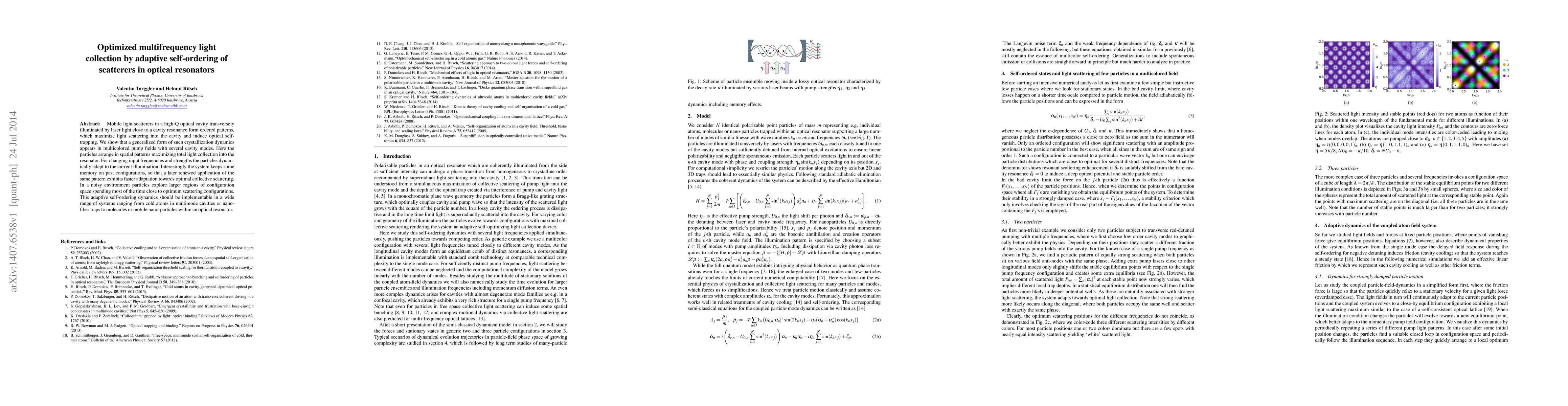 Mobile light scatterers in a high-Q optical cavity transversely illuminated by laser light close to a cavity resonance form ordered patterns, which maximize light scattering into the cavity and induce optical self-trapping. We show that a generalized form of such crystallization dynamics appears in multicolored pump fields with several cavity modes. Here the particles arrange in spatial patterns maximizing total light collection into the resonator. For changing input frequencies and strengths the particles dynamically adapt to the current illumination. Interestingly the system keeps some memory on past configurations, so that a later renewed application of the same pattern exhibits faster adaptation towards optimal collective scattering. In a noisy environment particles explore larger regions of configuration space spending most of the time close to optimum scattering configurations. This adaptive self-ordering dynamics should be implementable in a wide range of systems ranging from cold atoms in multimode cavities or nano-fiber traps to molecules or mobile nano-particles within an optical resonator.