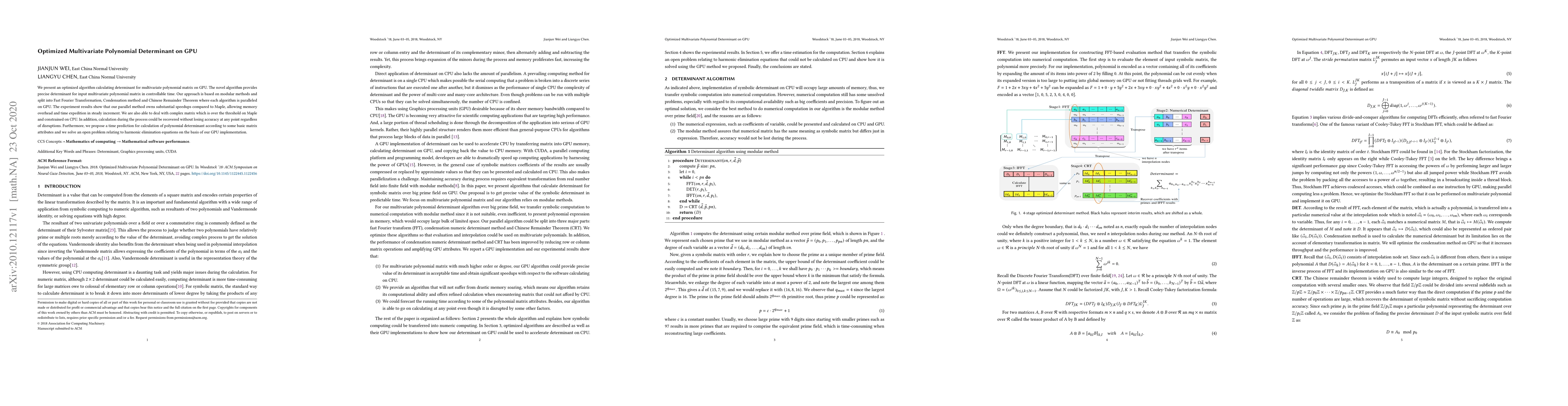 We present an optimized algorithm calculating determinant for multivariate polynomial matrix on GPU. The novel algorithm provides precise determinant for input multivariate polynomial matrix in controllable time. Our approach is based on modular methods and split into Fast Fourier Transformation, Condensation method and Chinese Remainder Theorem where each algorithm is paralleled on GPU. The experiment results show that our parallel method owns substantial speedups compared to Maple, allowing memory overhead and time expedition in steady increment. We are also able to deal with complex matrix which is over the threshold on Maple and constrained on CPU. In addition, calculation during the process could be recovered without losing accuracy at any point regardless of disruptions. Furthermore, we propose a time prediction for calculation of polynomial determinant according to some basic matrix attributes and we solve an open problem relating to harmonic elimination equations on the basis of our GPU implementation.