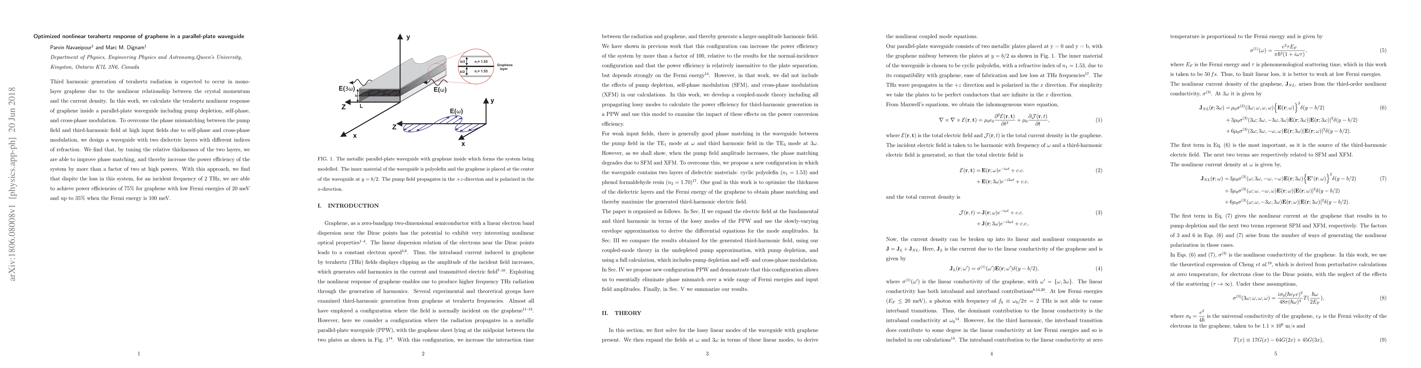 This study investigates the enhanced nonlinear terahertz response of monolayer graphene within a parallel-plate waveguide, optimizing third harmonic generation by adjusting the waveguide's dielectric layers to improve phase matching and power efficiency, achieving up to 75% efficiency for low Fermi energies.