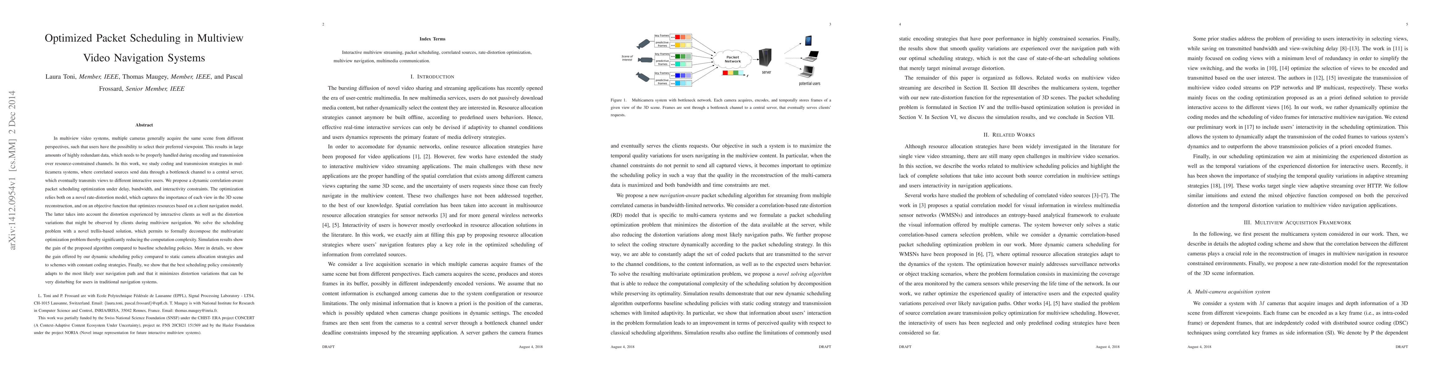 In multiview video systems, multiple cameras generally acquire the same scene from different perspectives, such that users have the possibility to select their preferred viewpoint. This results in large amounts of highly redundant data, which needs to be properly handled during encoding and transmission over resource-constrained channels. In this work, we study coding and transmission strategies in multicamera systems, where correlated sources send data through a bottleneck channel to a central server, which eventually transmits views to different interactive users. We propose a dynamic correlation-aware packet scheduling optimization under delay, bandwidth, and interactivity constraints. The optimization relies both on a novel rate-distortion model, which captures the importance of each view in the 3D scene reconstruction, and on an objective function that optimizes resources based on a client navigation model. The latter takes into account the distortion experienced by interactive clients as well as the distortion variations that might be observed by clients during multiview navigation. We solve the scheduling problem with a novel trellis-based solution, which permits to formally decompose the multivariate optimization problem thereby significantly reducing the computation complexity. Simulation results show the gain of the proposed algorithm compared to baseline scheduling policies. More in details, we show the gain offered by our dynamic scheduling policy compared to static camera allocation strategies and to schemes with constant coding strategies. Finally, we show that the best scheduling policy consistently adapts to the most likely user navigation path and that it minimizes distortion variations that can be very disturbing for users in traditional navigation systems.