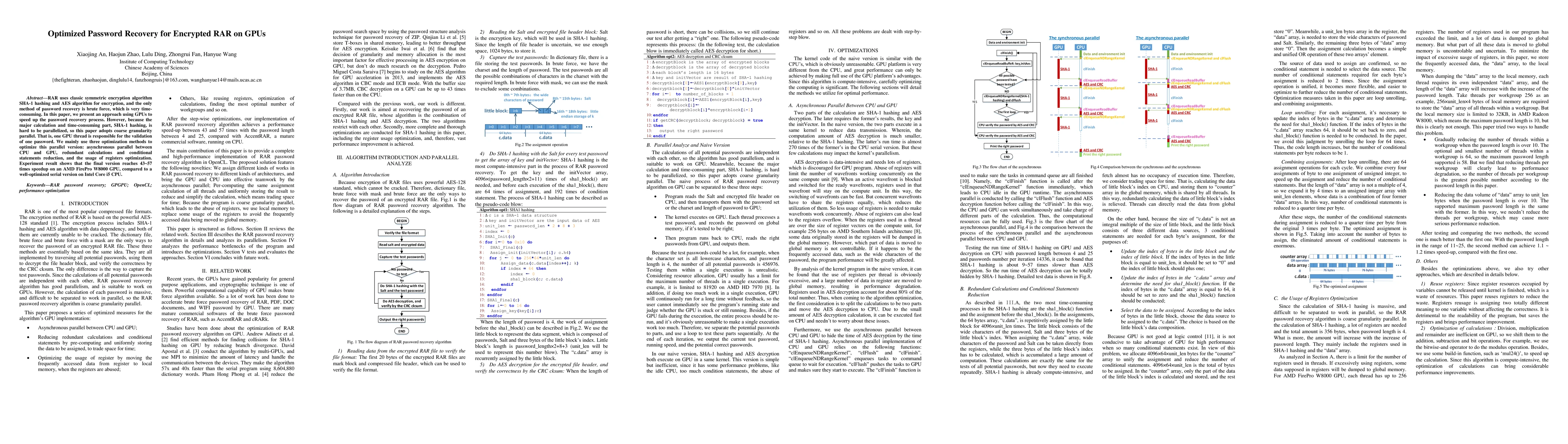 This paper proposes a GPU-based approach to accelerate password recovery for RAR files using brute force, optimizing parallel processing through asynchronous CPU-GPU interaction, redundant calculation reduction, and register optimization. Experimental results show a 43~57 times speedup on an AMD FirePro W8000 GPU compared to a serial version on an Intel Core i5 CPU.
