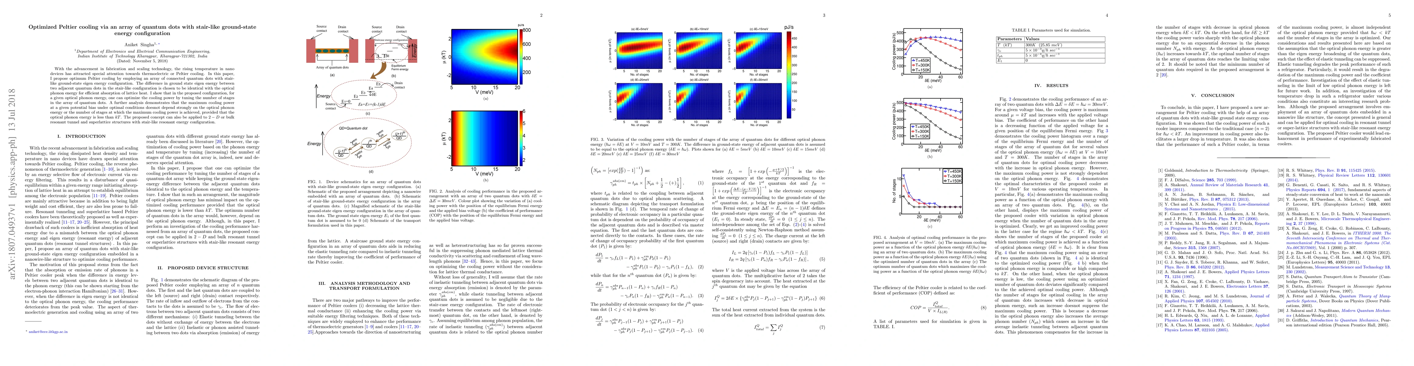 This paper proposes an optimized Peltier cooling method using an array of quantum dots with a stair-like ground-state energy configuration, where the energy difference between adjacent quantum dots matches the optical phonon energy for efficient heat absorption. The study demonstrates that the cooling power can be maximized by adjusting the number of quantum dot stages, and it shows that the optimal cooling power is relatively independent of phonon energy and the number of stages under certain conditions.