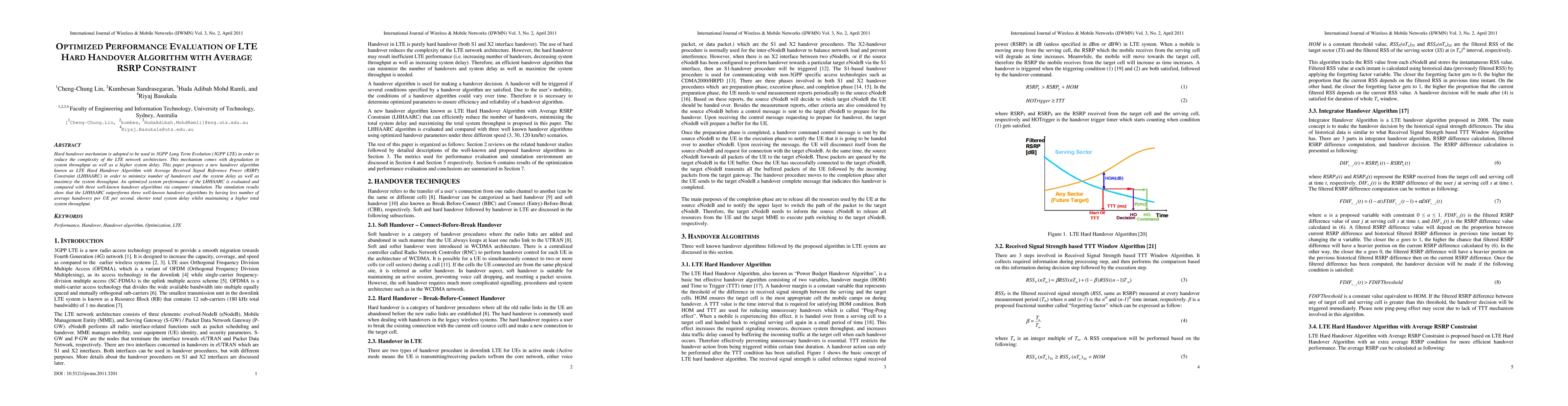 This paper proposes the LTE Hard Handover Algorithm with Average RSRP Constraint (LHHAARC) to minimize handovers, reduce system delay, and maximize throughput in LTE networks. Simulation results show LHHAARC outperforms three existing algorithms by reducing handovers and delays while increasing throughput.