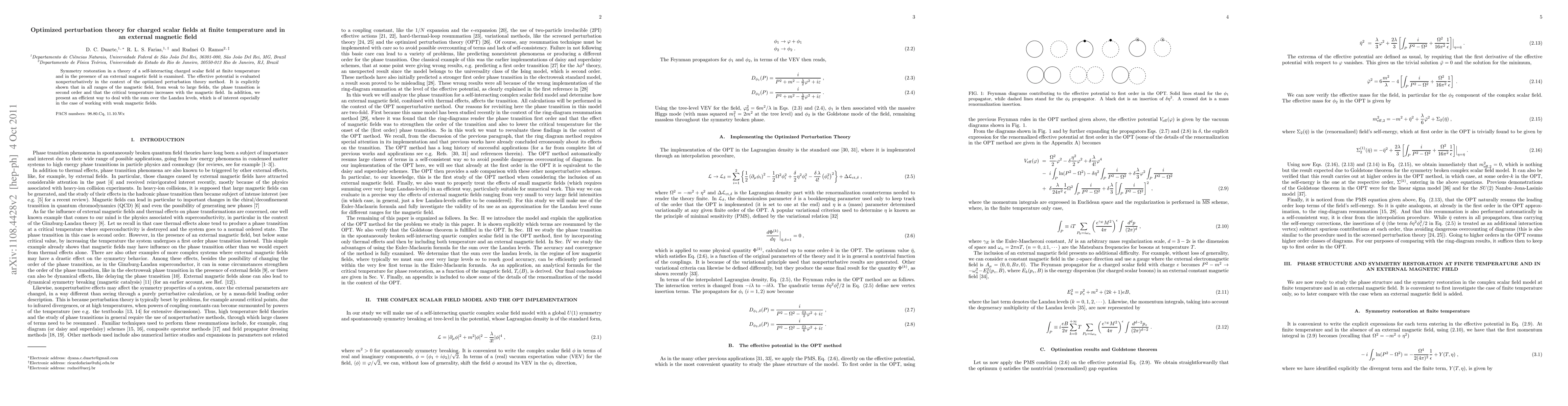 This paper employs optimized perturbation theory to study symmetry restoration in charged scalar fields at finite temperature and in an external magnetic field, demonstrating a second-order phase transition with an increasing critical temperature as the magnetic field strength rises. It also introduces an efficient method for summing over Landau levels, particularly useful for weak magnetic fields.