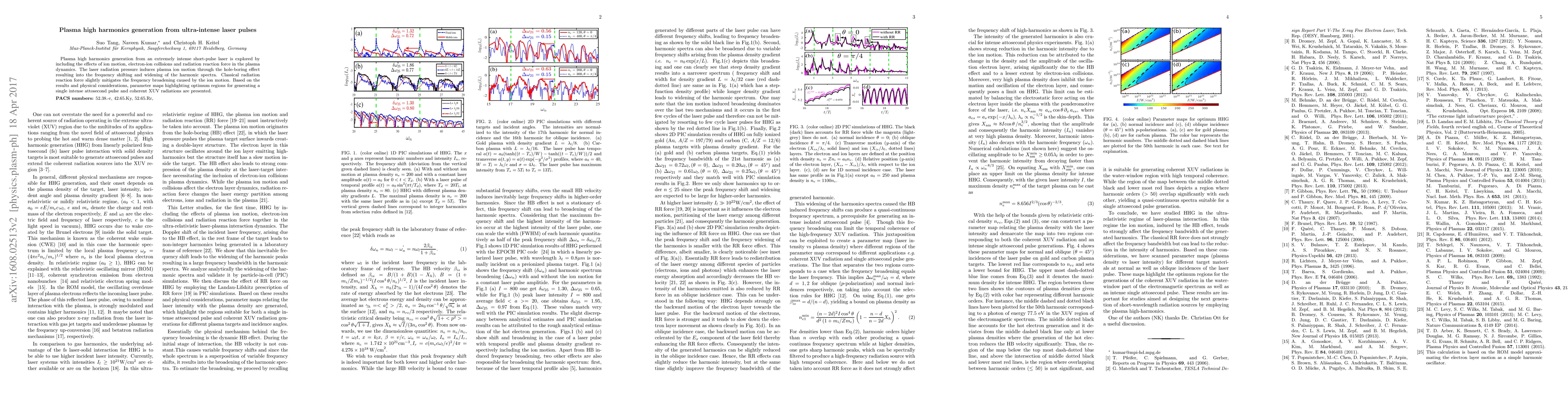 This research investigates optimized plasma high harmonics generation using ultra-intense laser pulses, considering ion motion, electron-ion collisions, and radiation reaction force. The study reveals that classical radiation reaction force can mitigate frequency broadening, and presents parameter maps for optimal conditions to generate intense attosecond pulses and coherent XUV radiation.