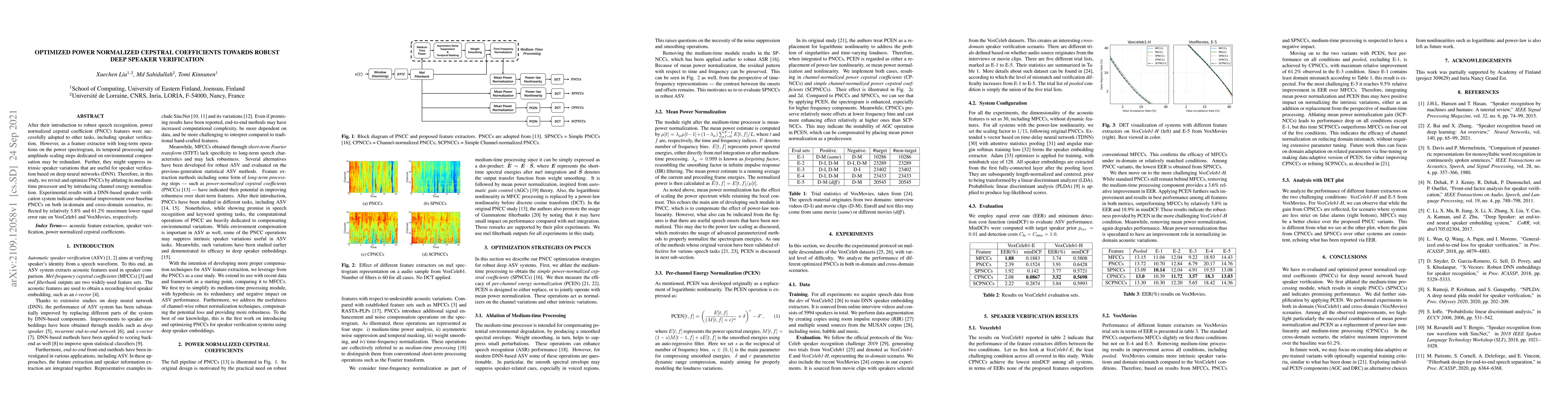 This paper optimizes power normalized cepstral coefficients (PNCC) for speaker verification by removing redundant temporal processing and introducing channel energy normalization, leading to significant improvements in DNN-based verification systems, with a 5.8% and 61.2% reduction in equal error rates on VoxCeleb1 and VoxMovies.