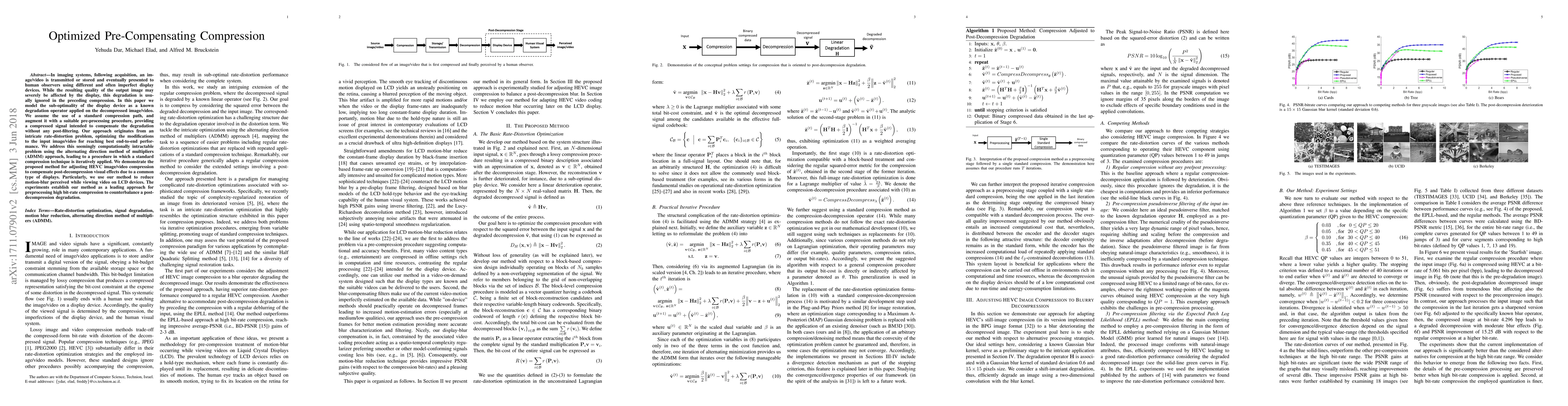 In imaging systems, following acquisition, an image/video is transmitted or stored and eventually presented to human observers using different and often imperfect display devices. While the resulting quality of the output image may severely be affected by the display, this degradation is usually ignored in the preceding compression. In this paper we model the sub-optimality of the display device as a known degradation operator applied on the decompressed image/video. We assume the use of a standard compression path, and augment it with a suitable pre-processing procedure, providing a compressed signal intended to compensate the degradation without any post-filtering. Our approach originates from an intricate rate-distortion problem, optimizing the modifications to the input image/video for reaching best end-to-end performance. We address this seemingly computationally intractable problem using the alternating direction method of multipliers (ADMM) approach, leading to a procedure in which a standard compression technique is iteratively applied. We demonstrate the proposed method for adjusting HEVC image/video compression to compensate post-decompression visual effects due to a common type of displays. Particularly, we use our method to reduce motion-blur perceived while viewing video on LCD devices. The experiments establish our method as a leading approach for preprocessing high bit-rate compression to counterbalance a post-decompression degradation.