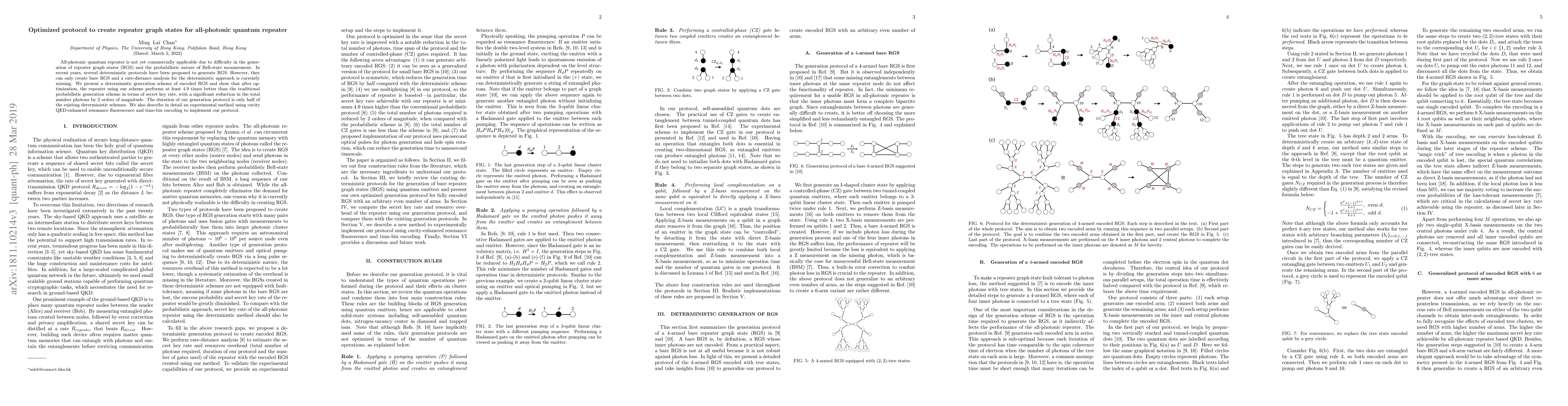 This paper proposes an optimized deterministic protocol for generating encoded repeater graph states for all-photonic quantum repeaters, significantly improving secret key rate and reducing photon count by 2 orders of magnitude compared to traditional probabilistic methods. The protocol duration is halved, and an experimental method using cavity QED-enhanced resonance fluorescence and time-bin encoding is detailed.