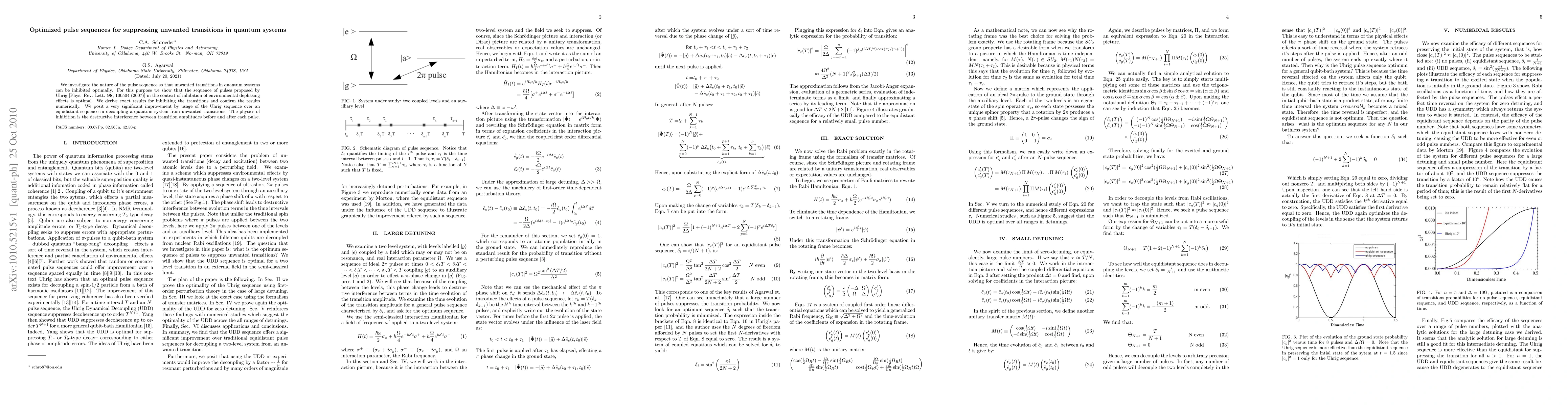 This paper explores optimized pulse sequences to suppress unwanted transitions in quantum systems, confirming the Uhrig sequence's effectiveness in inhibiting such transitions through destructive interference. Numerical results show a significant improvement over equidistant pulse sequences in decoupling quantum systems.